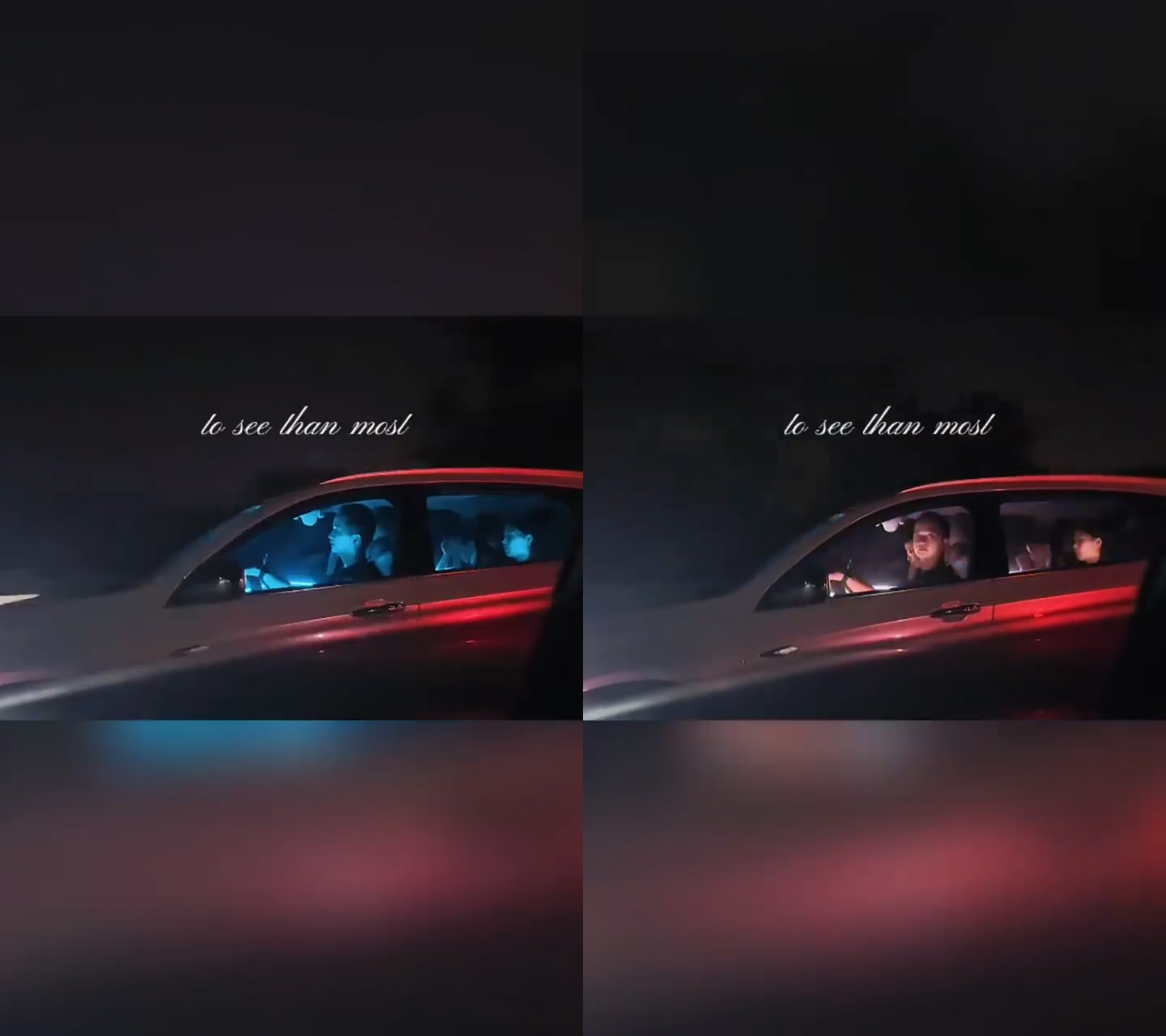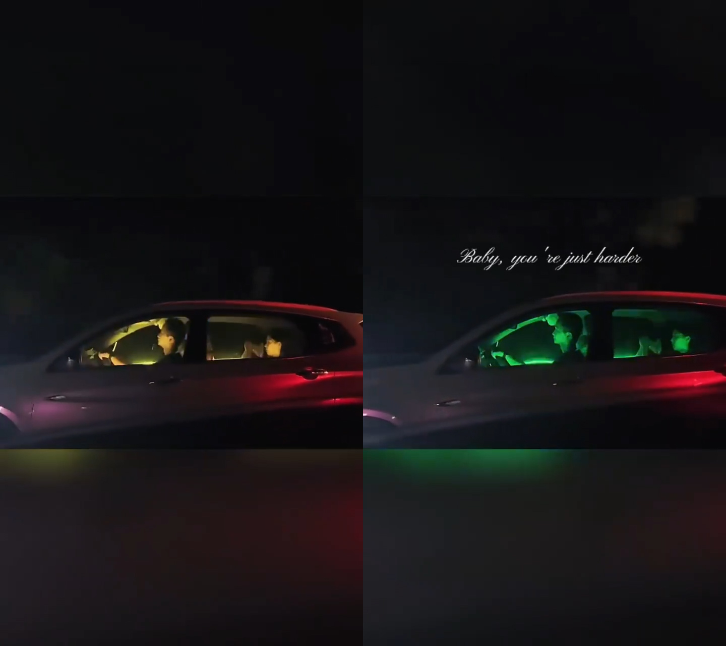 ▼ 影片中的 SUV 轿车,车上除了正在开车的驾驶者,后座还坐着2位乘客… 这都不是重点,重点是车内一闪一闪的灯光!灯光颜色一直变来变去… 白色、黄色、青色、紫色….. 闪啊闪….