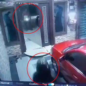 ▼ 屋主成功把门关上了!差点滑倒的抢匪就这样吃了闭门羹被关在外面进不去。