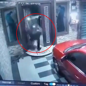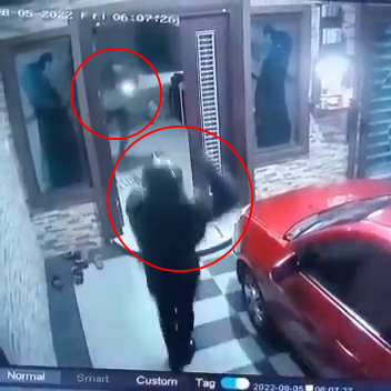 ▼ 抢匪知道自己被发现后举起巴冷刀加快脚步冲进去,屋主反应敏捷立刻把门关上!