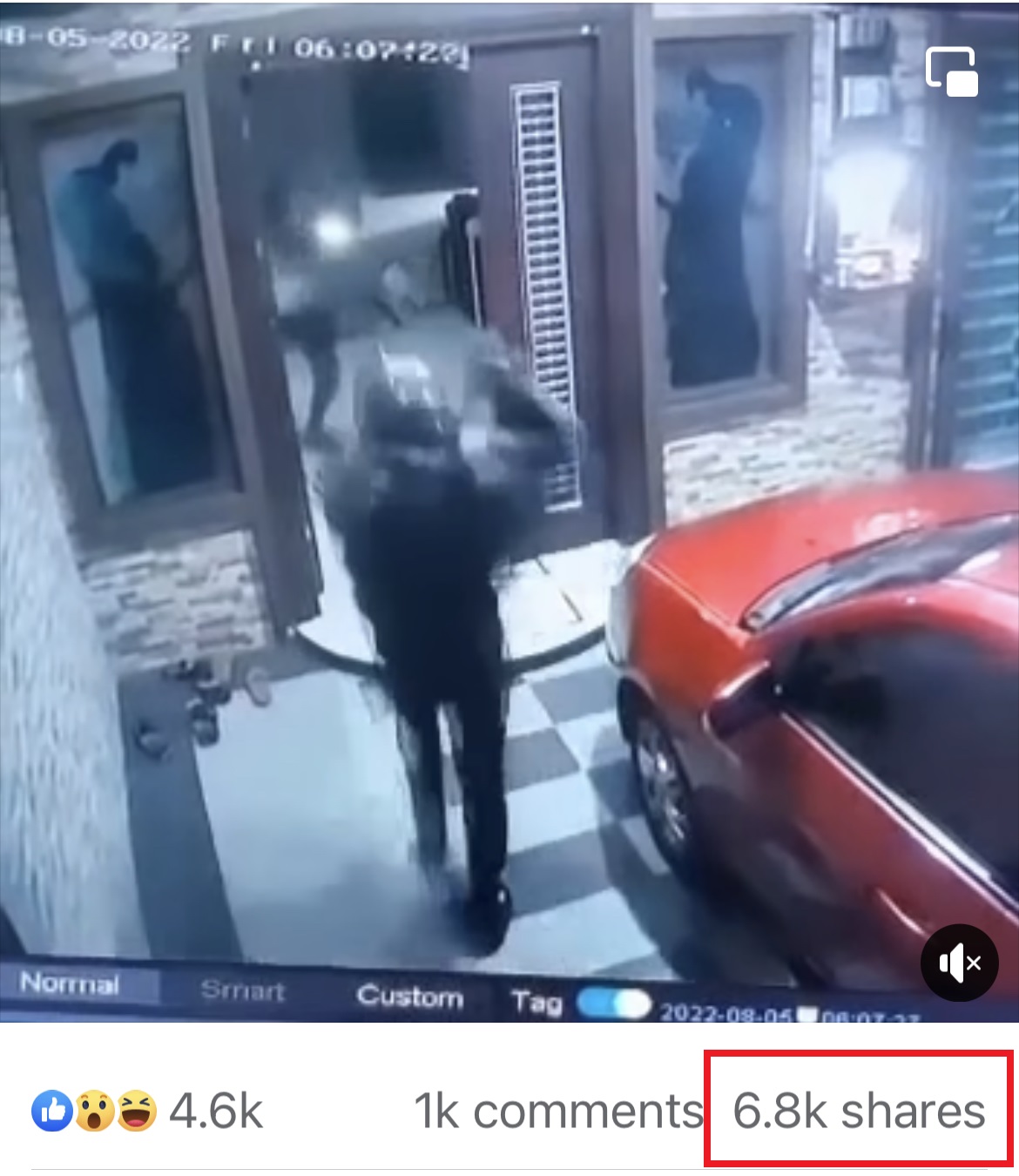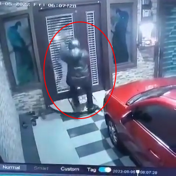 ▼ 短短7秒钟的CCTV画面中,一名戴着头盔、手拿巴冷刀的男子突然出现在门口,正准备走进屋内抢劫。这时屋主刚好迎面走过来与他四目相对!