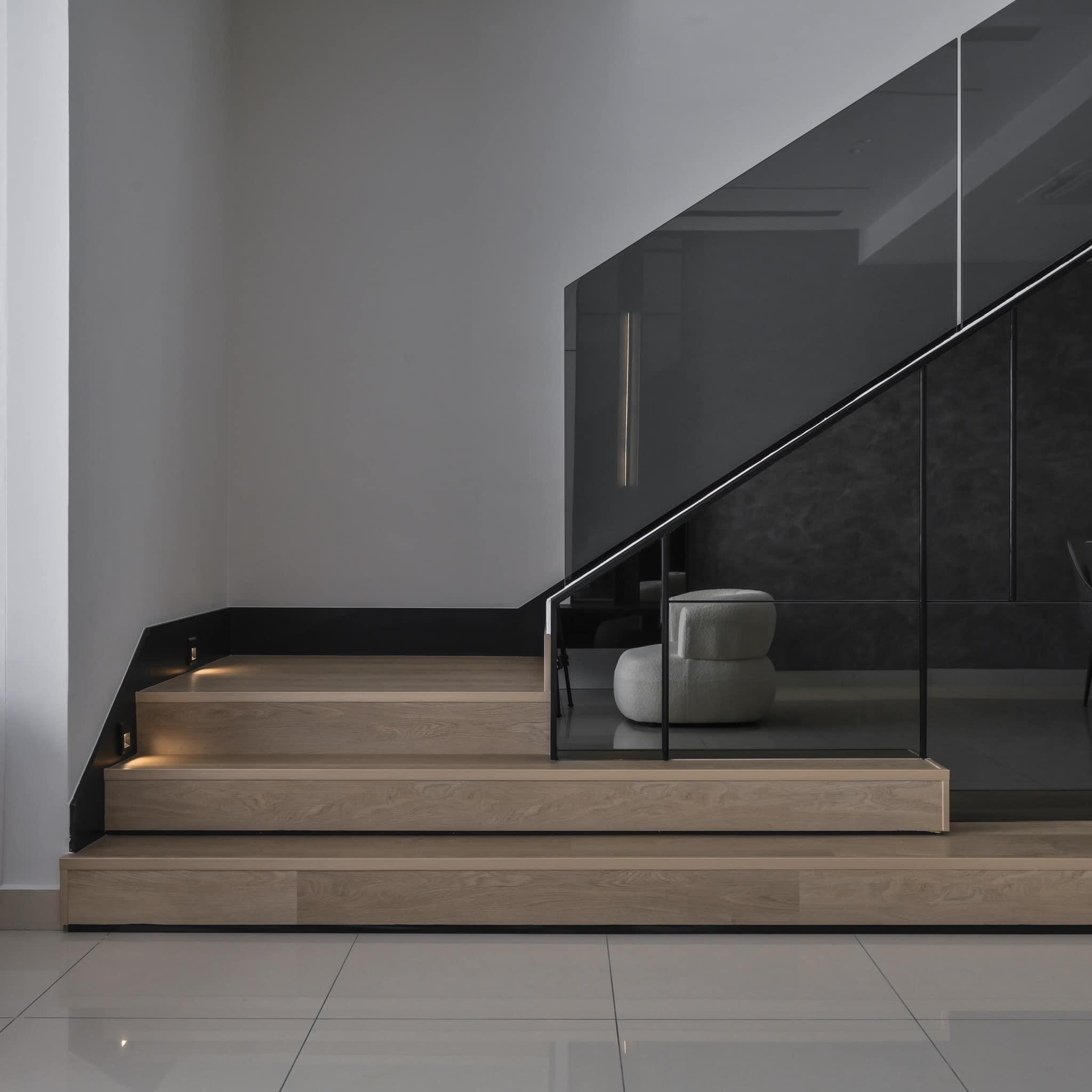 台阶:台阶采用了木质地板,同时搭配黄灯暖光,打造出简单却不失高级的舒适感。
