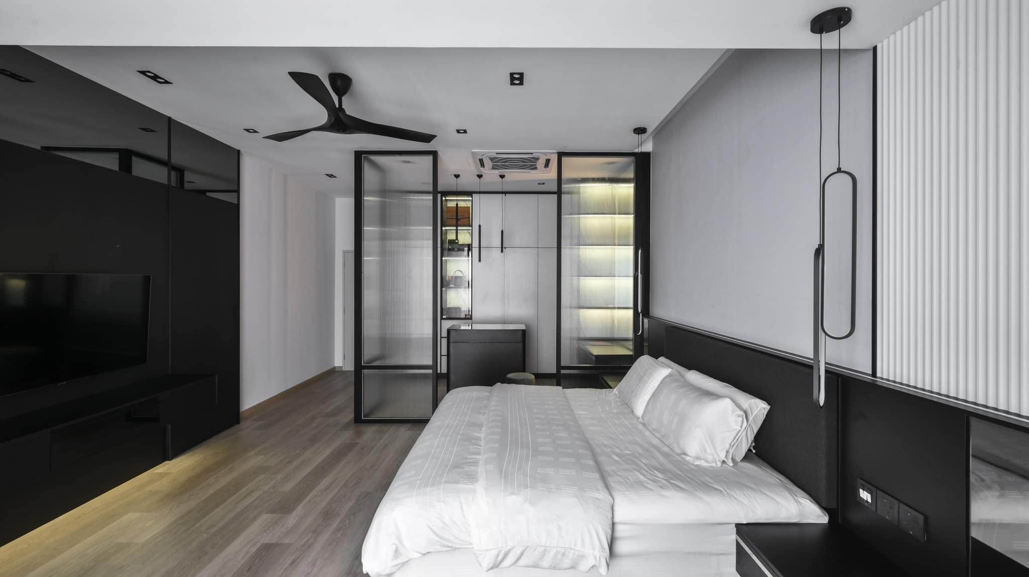主人房:依旧是以黑白灰三个颜色做为主题,设计风格也和一楼一样。不同的是,主人房的木质地板让卧室看起来更有舒适感。