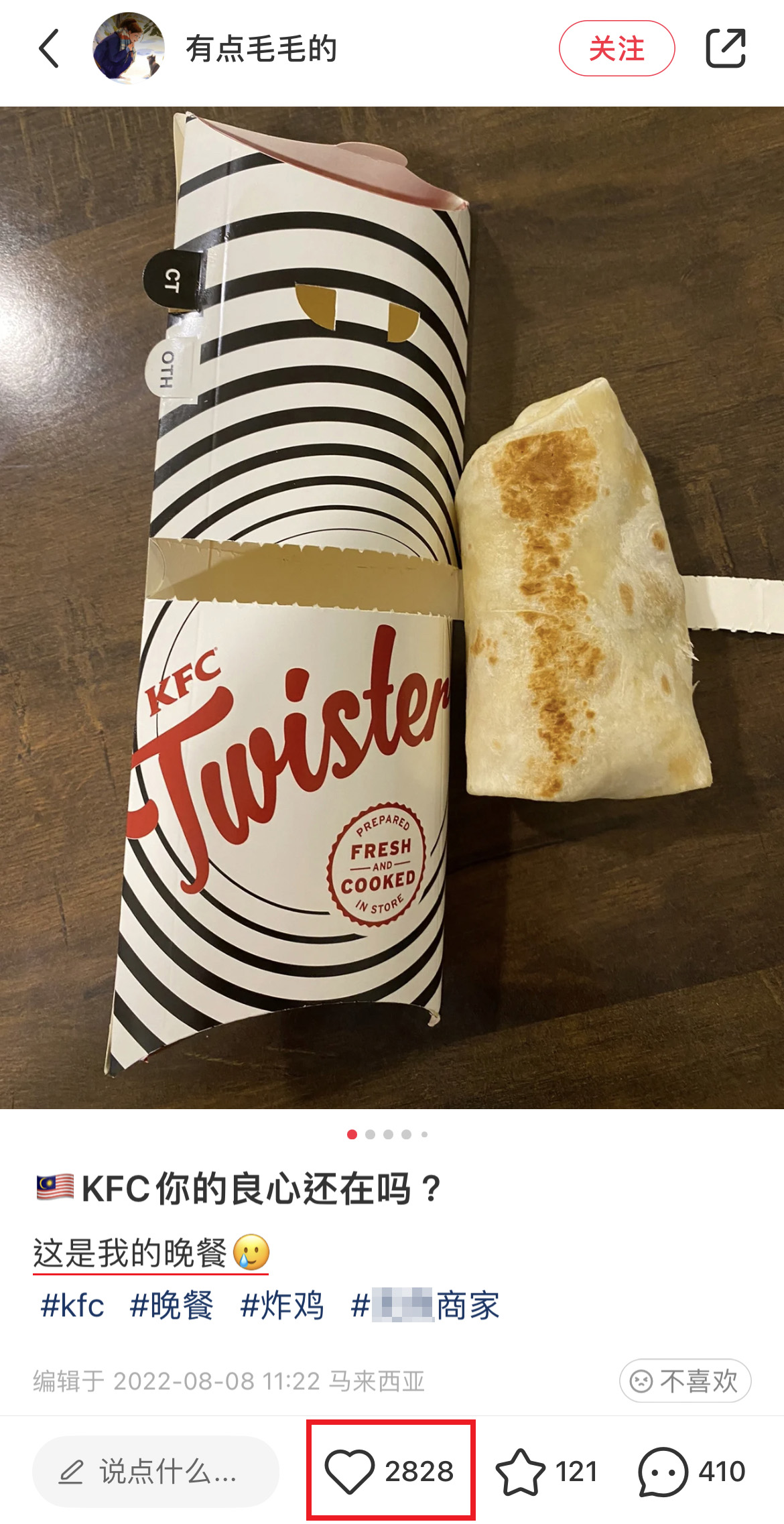然而近日一名大马网友心血来潮,晚餐点了一份 Cheezy Twister 结果“意外翻车”,难过的心情直落谷底。(终究是错付了… )