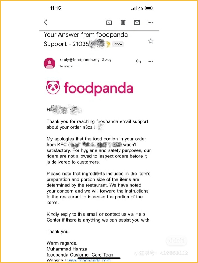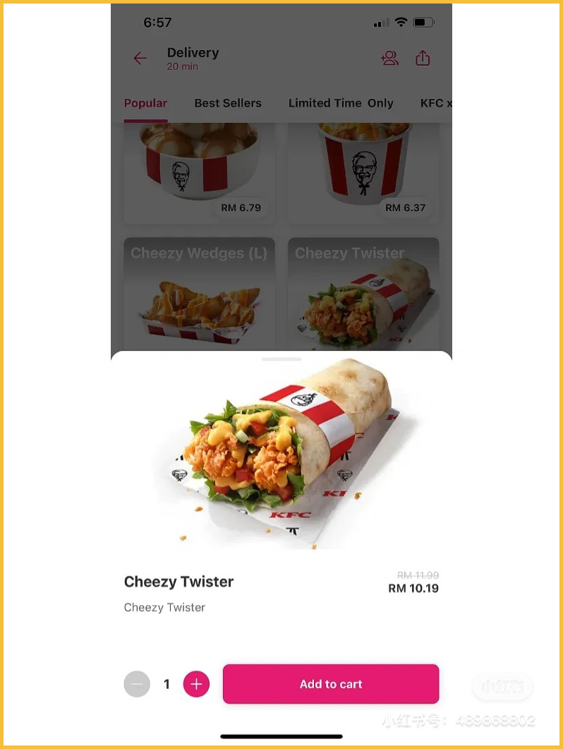 ▼ 事主通过 Foodpanda 外卖平台下单点了一份RM10.19的肯德基 Cheezy Twister 做为晚餐。
