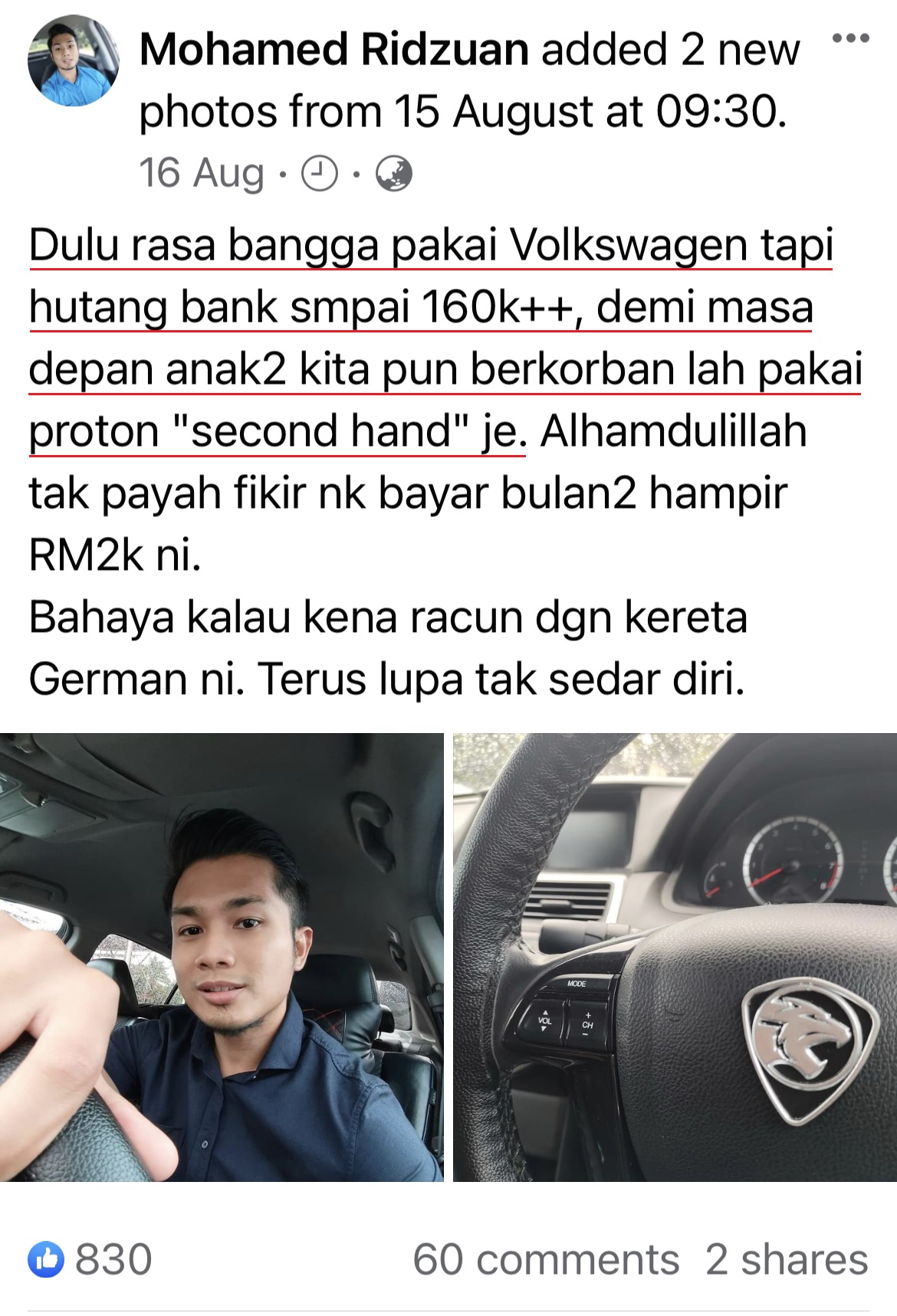 不过这名大马医生恰恰相反!他意识到自己的经济能力有限,狠下心将自己的名贵爱车 Volkswagen 卖掉,改驾二手的国产轿车 Proton Perdana!
