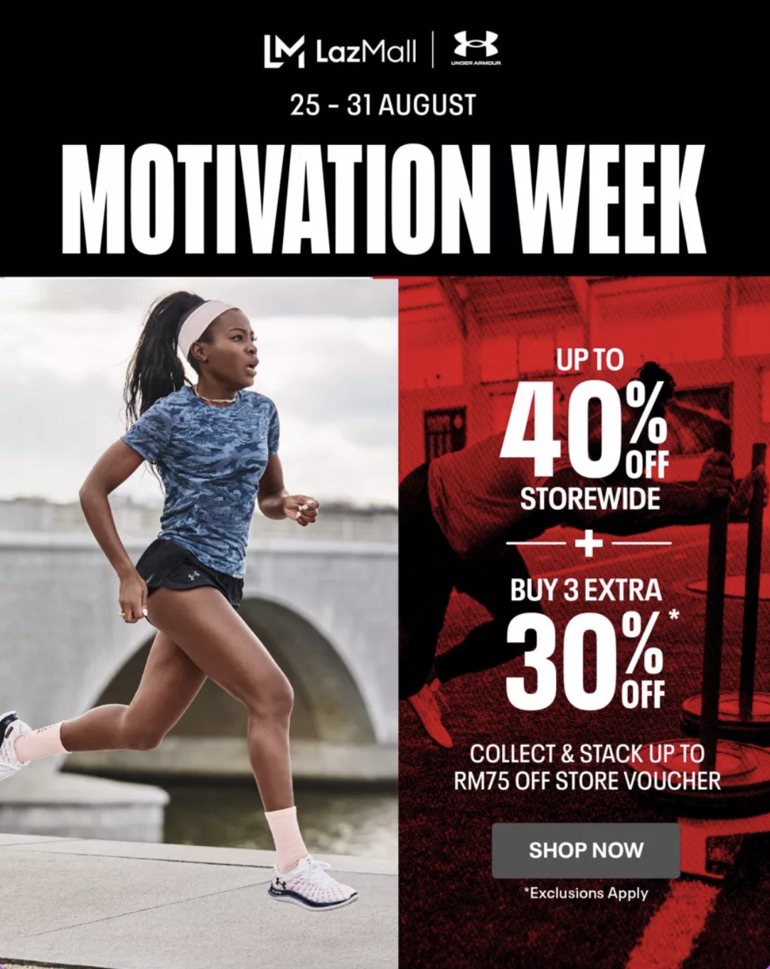 从今天起的连续7天,大马 Under Armour 在 Lazada 官方店铺举办 Payday 大促销,全店折扣高达40%,买3件以上商品可获额外30%折扣,还有多达RM75的折扣优惠券!