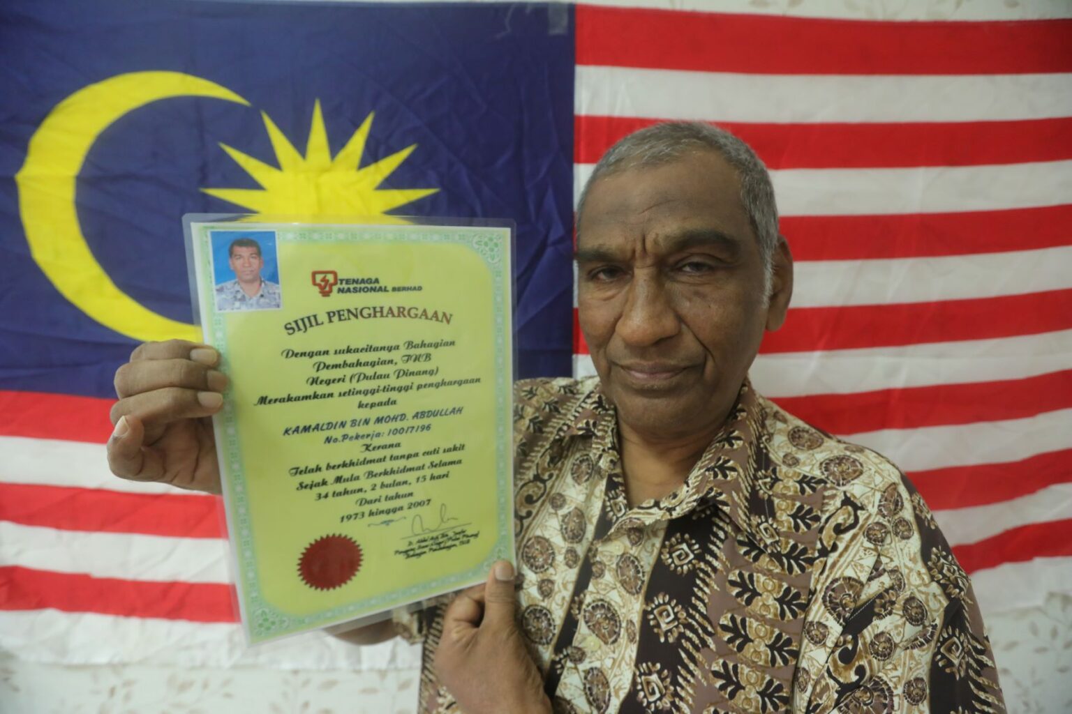 根据《星洲日报》报道,现年71岁的卡玛丁在退休之前,是在槟州国能(TNB)担任助理的职位。他就职服务的这34年以来,从来没有拿过一天病假。他说最只要的原因是他对这份工作的热衷及忠诚。