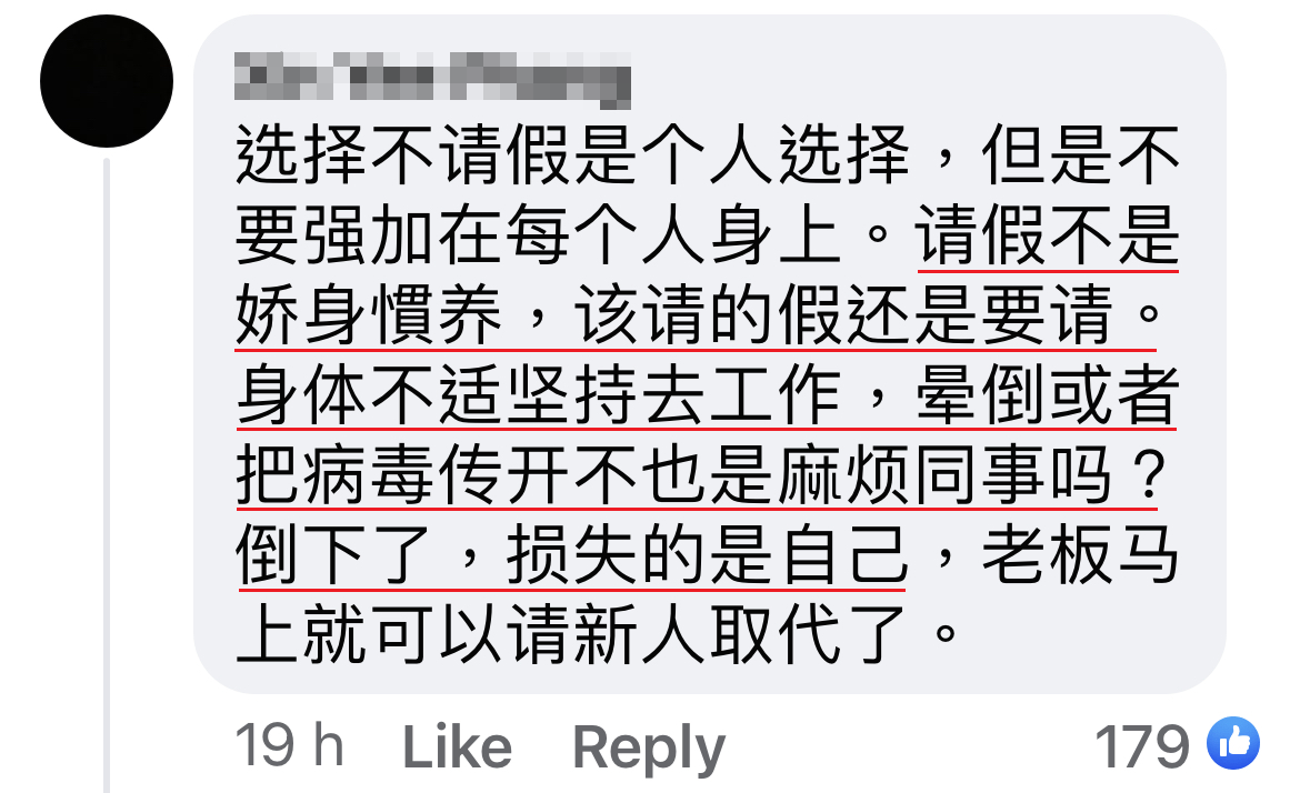 「你看现在的人(私人界或公务员),一点点事或累就拿病假,下大雨、头晕、摩哆爆胎也拿假,其实不必如此骄生惯养。」