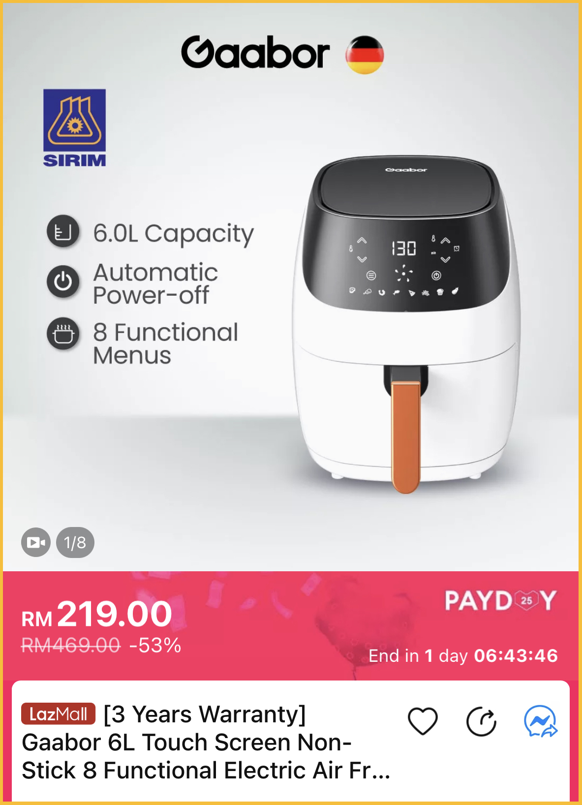 ▪ ⑩ Gaabor 6L 8 Functional Electric Air Fryer GA-E6A 空气炸锅