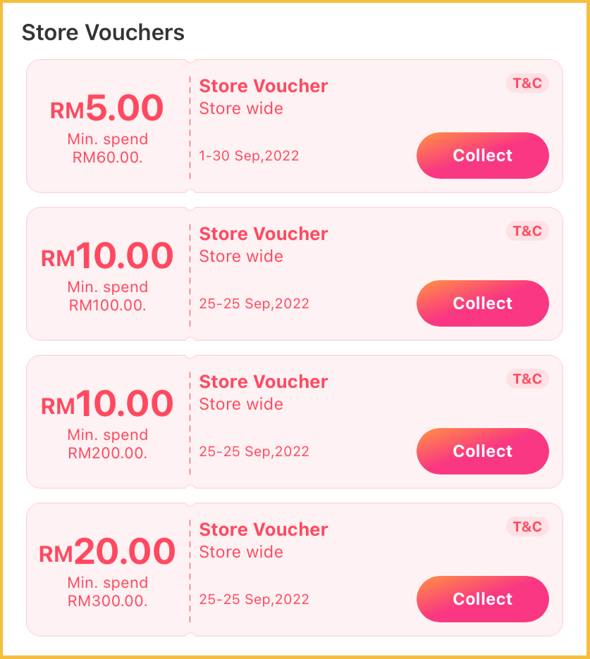 - 消费满RM300,折扣RM20