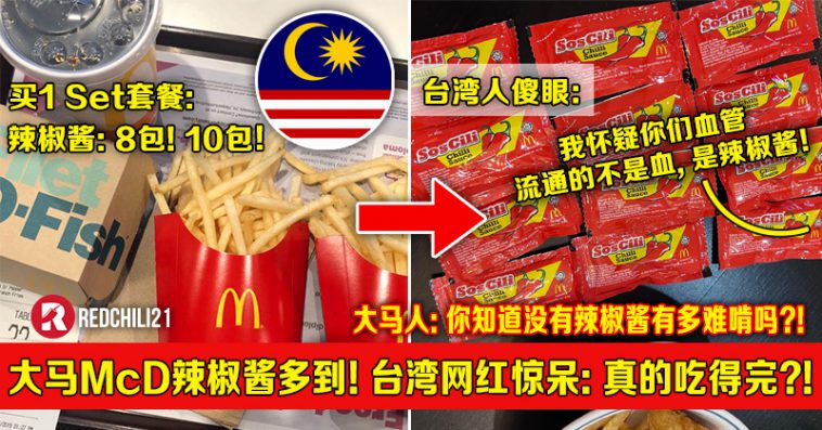 大马McD「1份套餐给10包」辣椒酱多到!台湾网红惊呆:你们血管流通的不是血!是辣椒酱!
