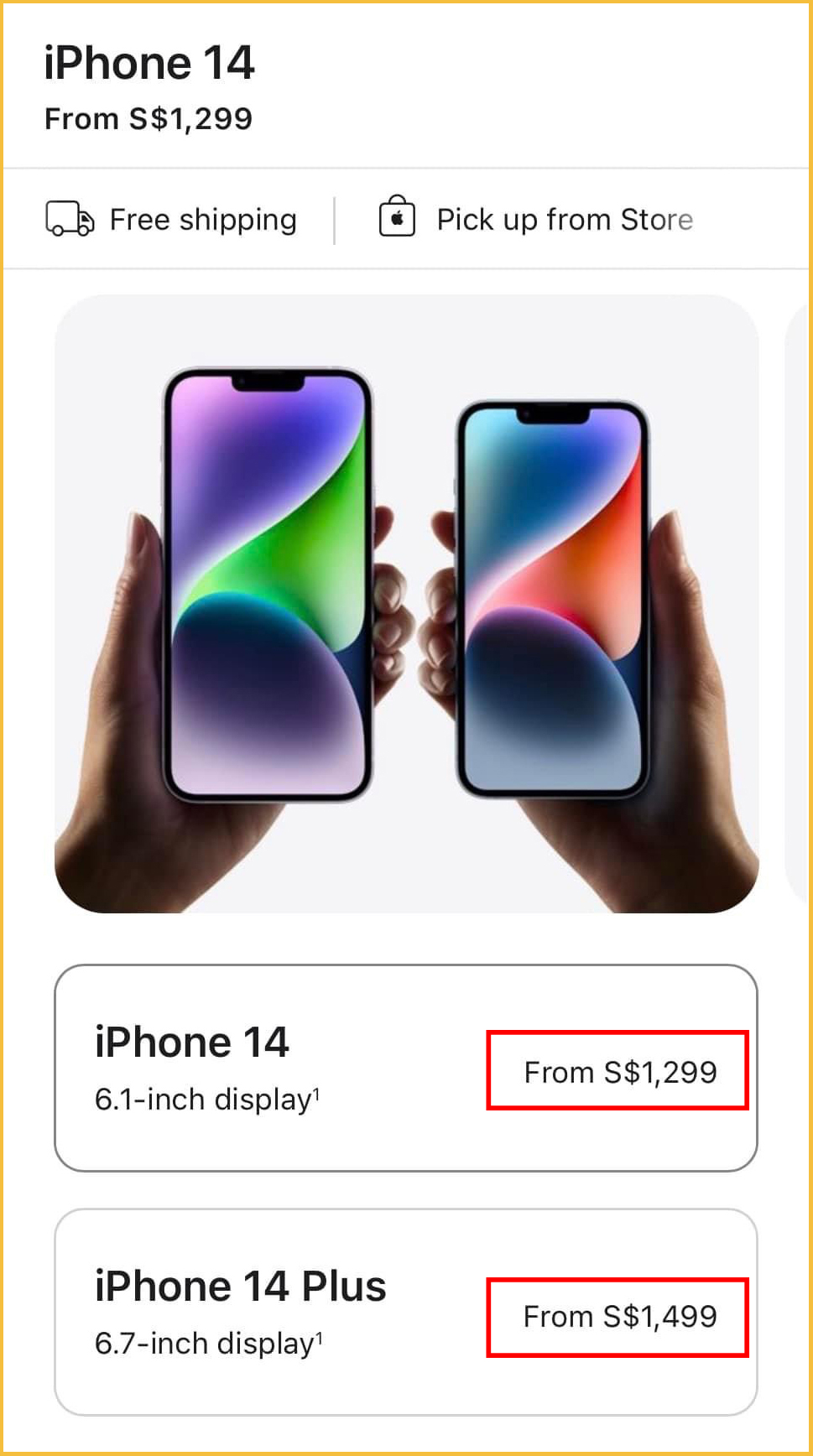 ▼ 新加坡:iPhone 14 S$1,299起 | iPhone 14 Plus S$1,499起