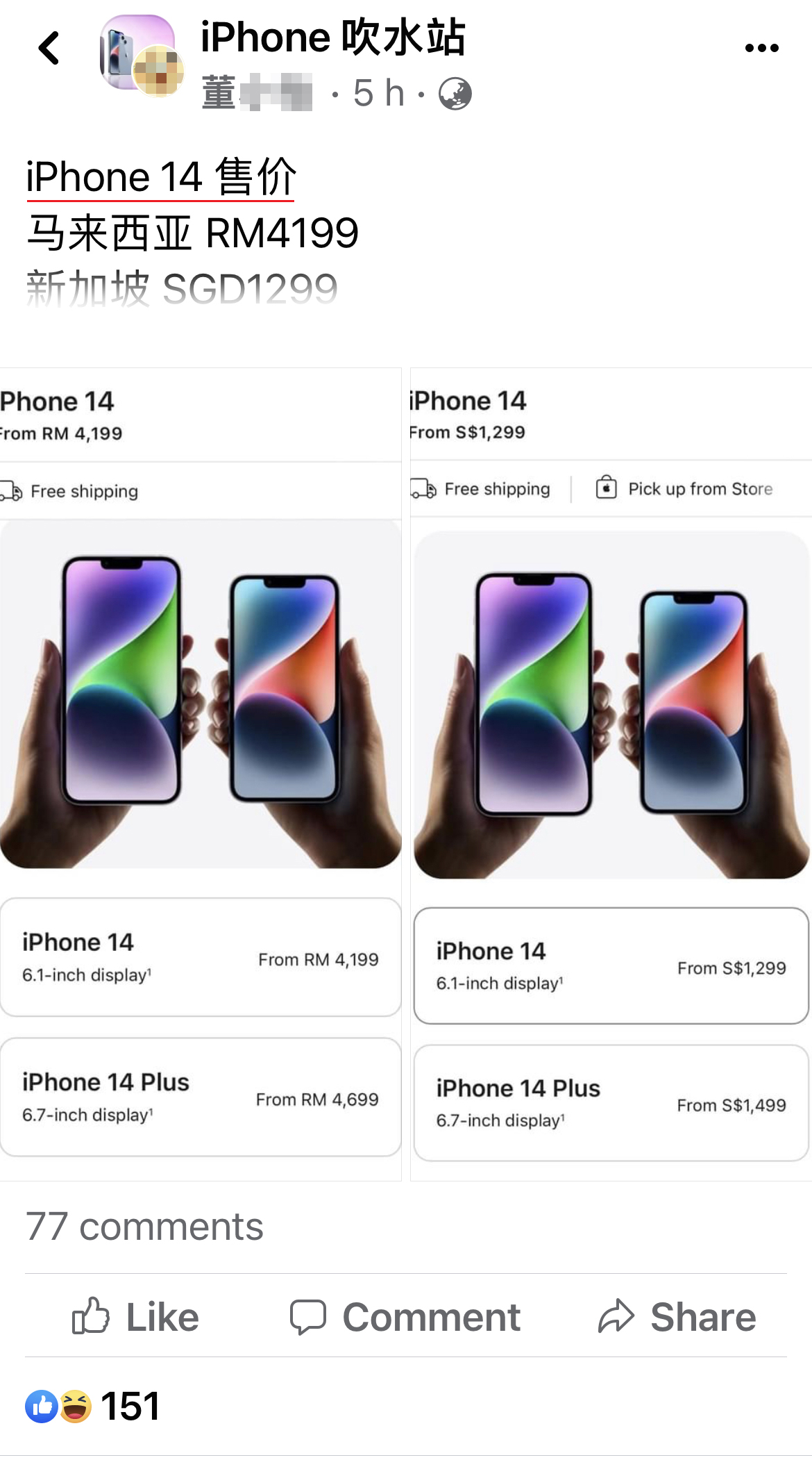 iPhone 14 售价:马来西亚 RM4,199 | 新加坡 SGD1,299