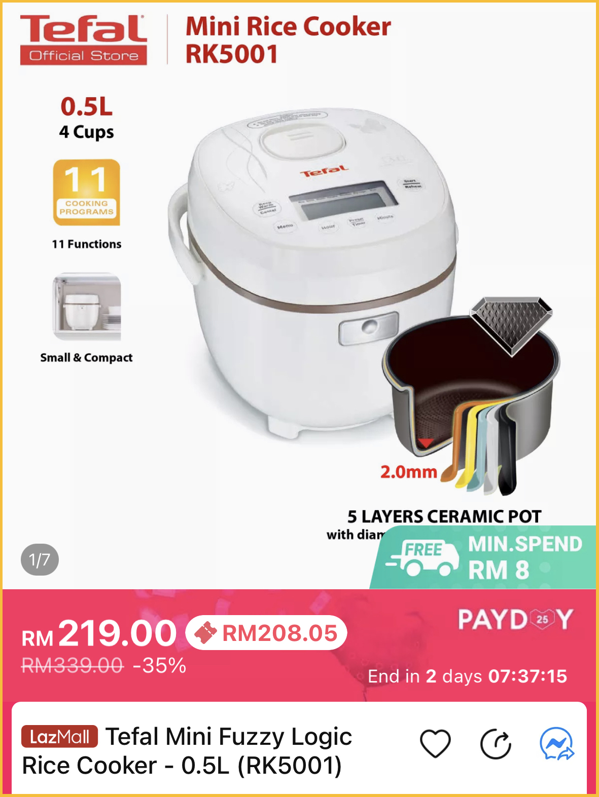 Tefal Mini Fuzzy Logic Rice Cooker – 0.5L (RK5001) 迷你电饭锅
