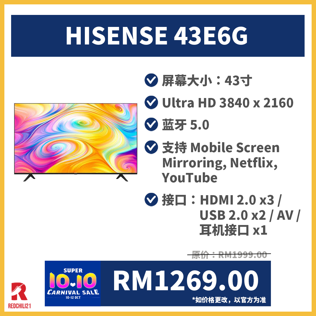▪ ⑧ Hisense 43E6G 43″ 4K UHD 智能电视