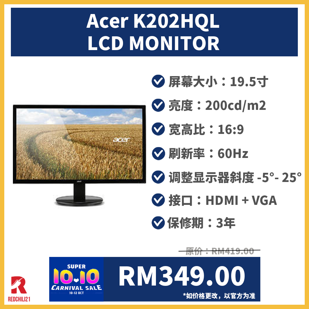 ACER 19.5” LCD MONITOR K202HQL ABIX 显示器