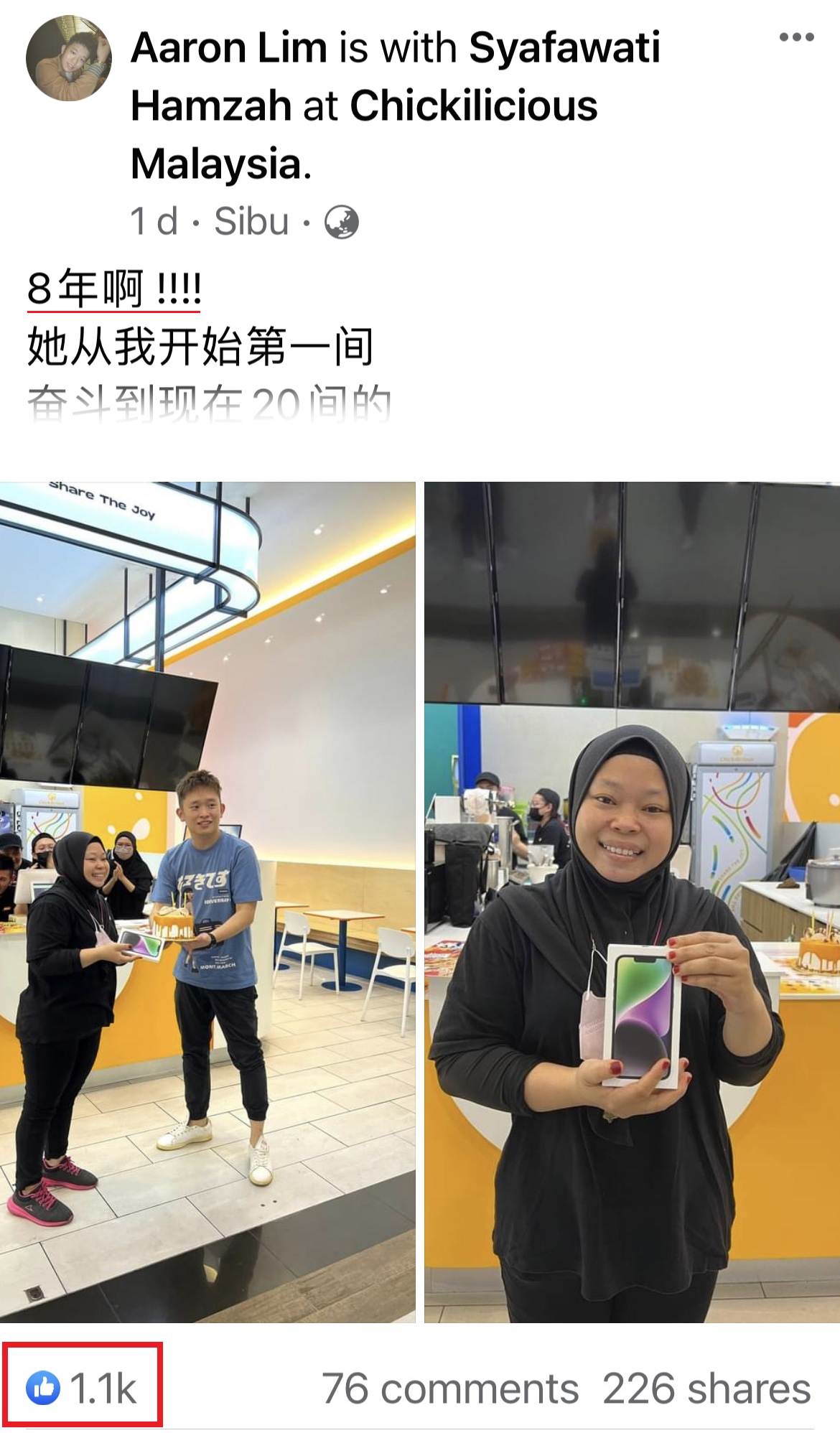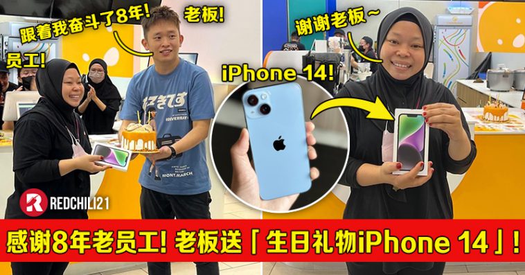 在全马拥有超过20家连锁店的炸鸡品牌——Chickilicious,近日为了感谢一位8年以来共同奋斗的老员工,老板特别送上最新的 iPhone 14作为生日礼物,让该名员工又惊喜又感动!