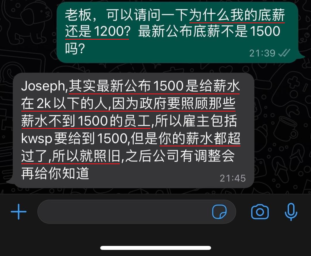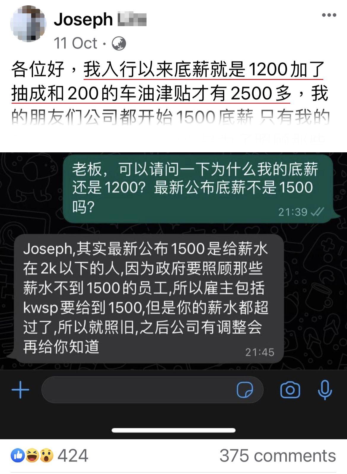我的朋友们公司都开始RM1500底薪,只有我的老板跟我说底薪RM1500是为了照顾那些外劳,然后我超过了就没有。