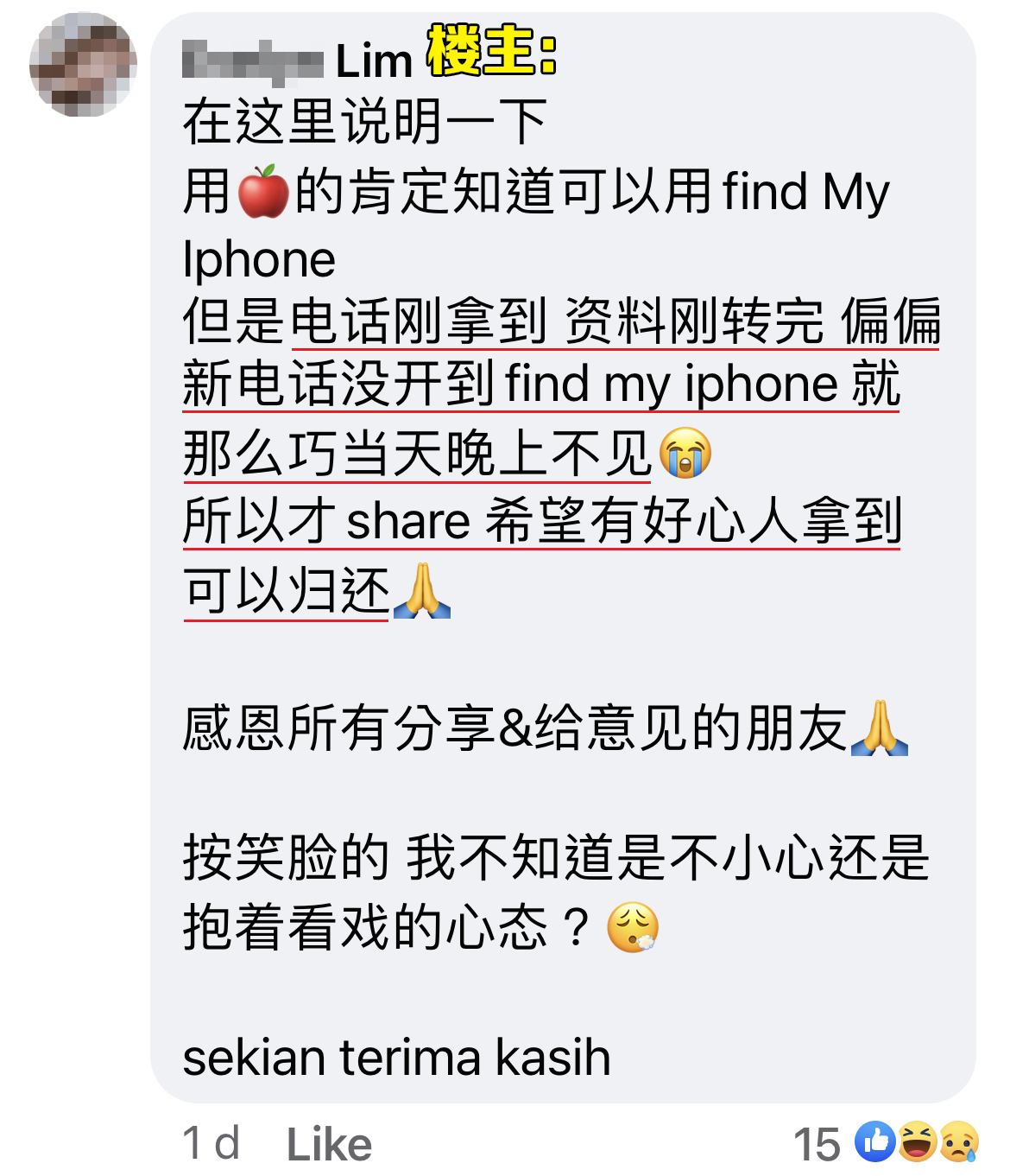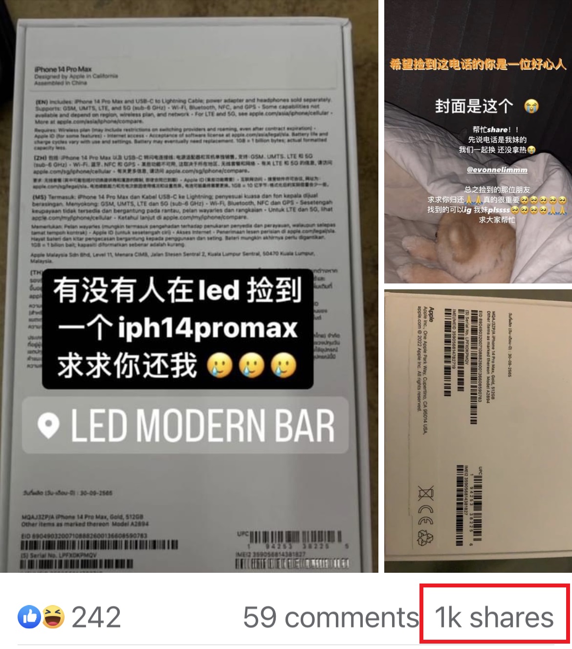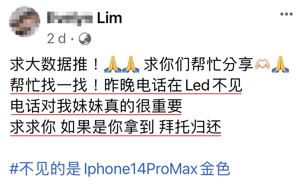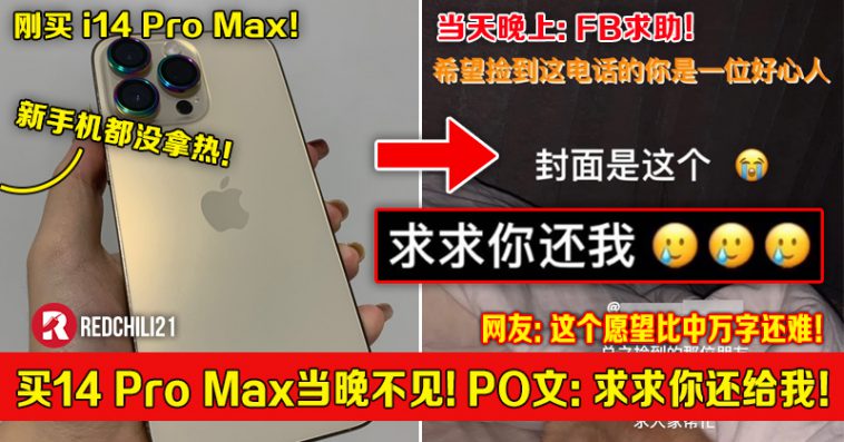 一名大马女子日前透过脸书PO文求助,刚买一支价值七千多块的 iPhone 14 Pro Max,白天才拿到手晚上就不见了,心痛可想至及!两姐妹只能借助广大网民的力量寻找“一线生机”….