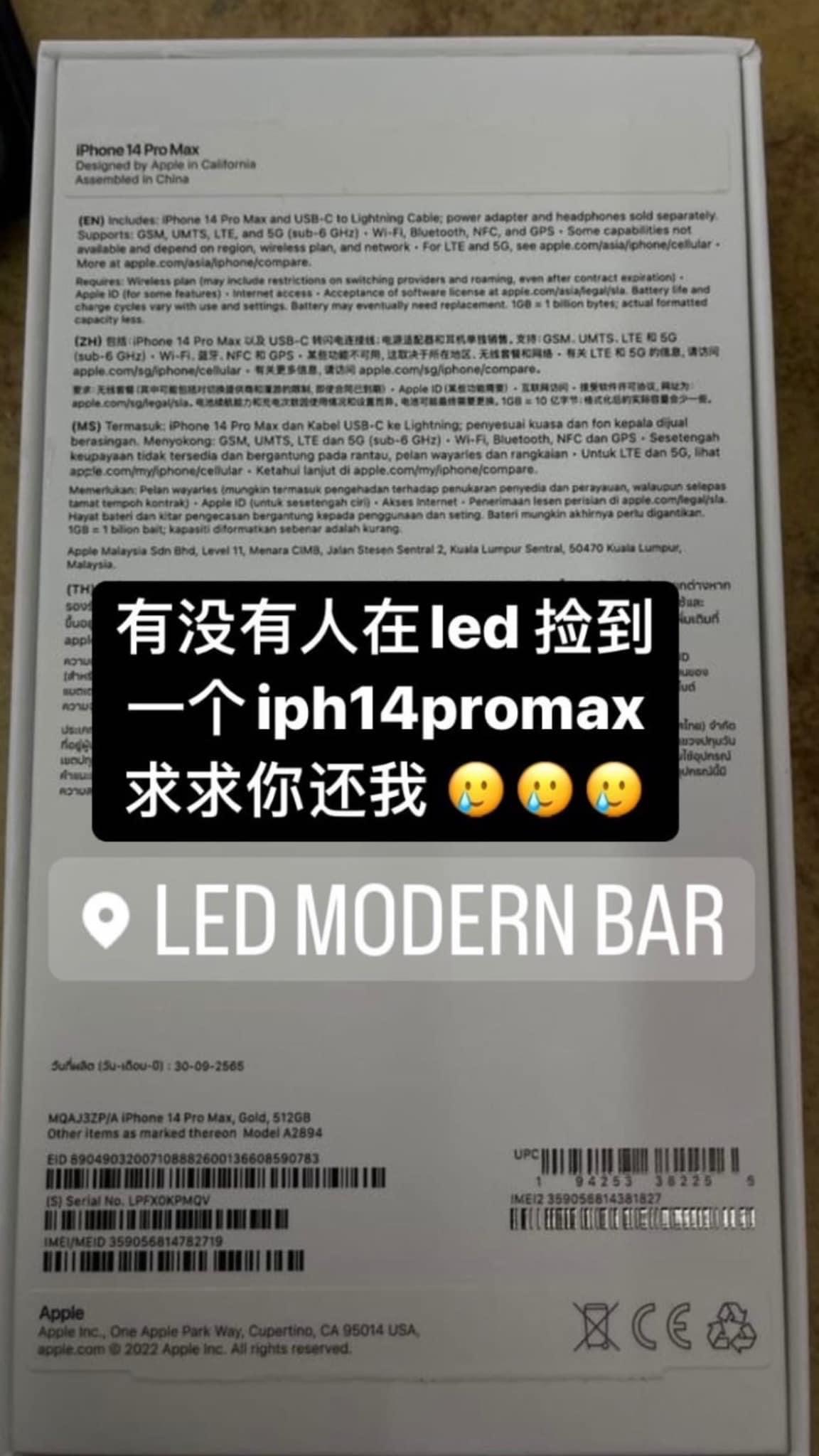 据帖文透露,来自新山的两姐妹当天一起去买了最新的 iPhone 14 Pro Max,结果手机都还没“拿热”,当晚妹妹的新 iPhone 就在一家酒吧弄丢了,怎么找都找不到!