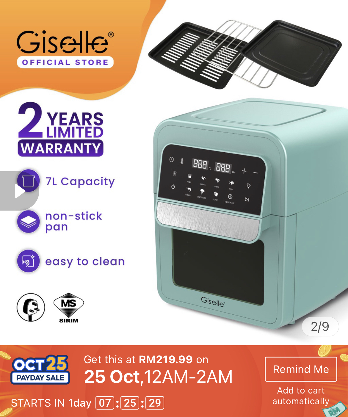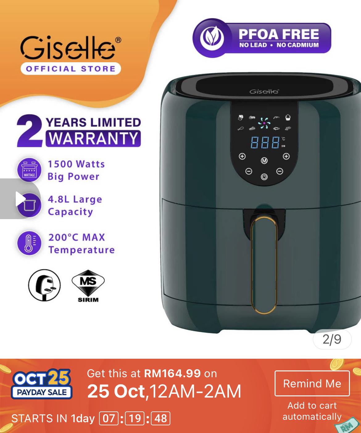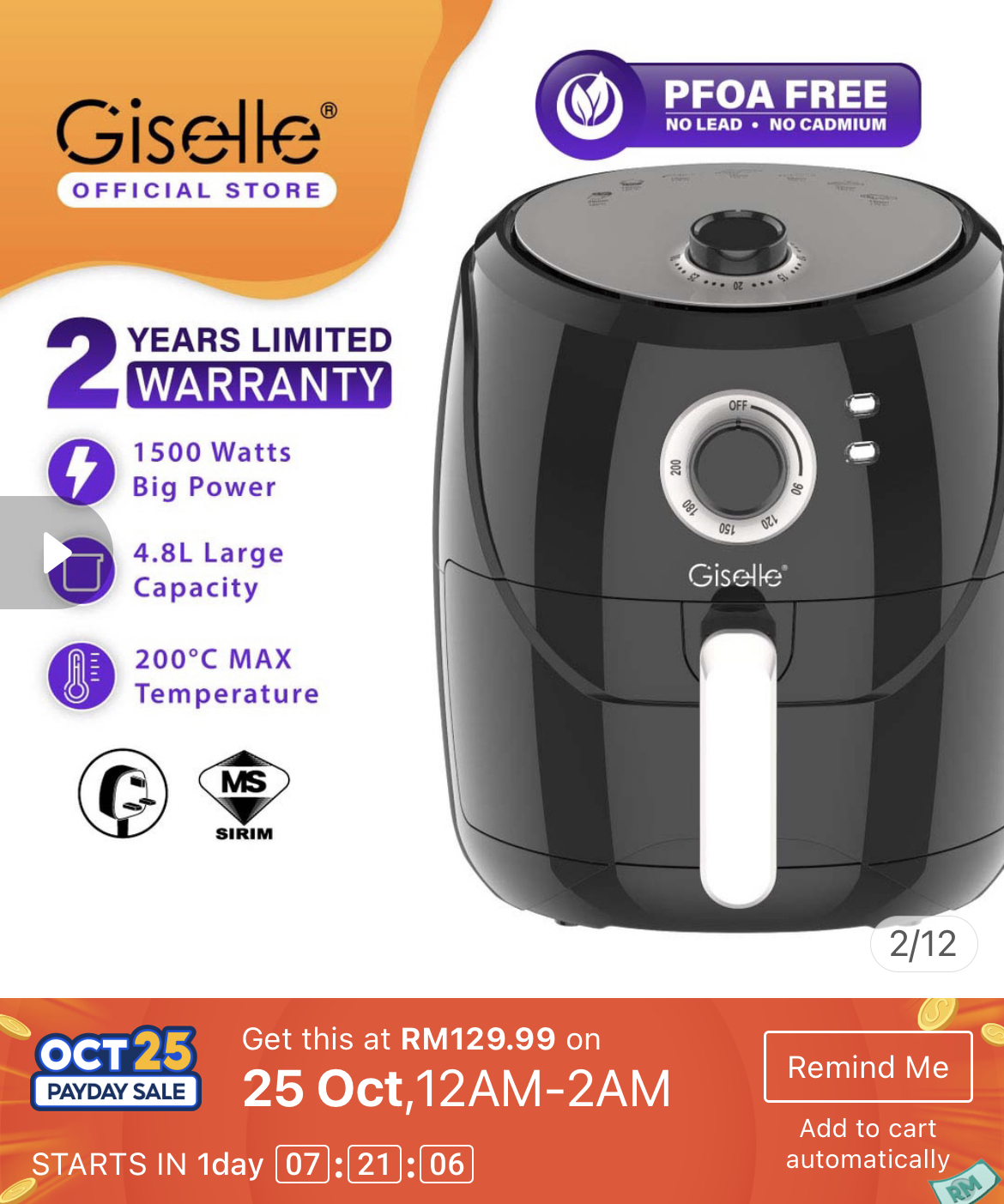 一日特价优惠!Giselle家电【Payday大促销】折扣高达60%!热卖款空气炸锅只需RM129!