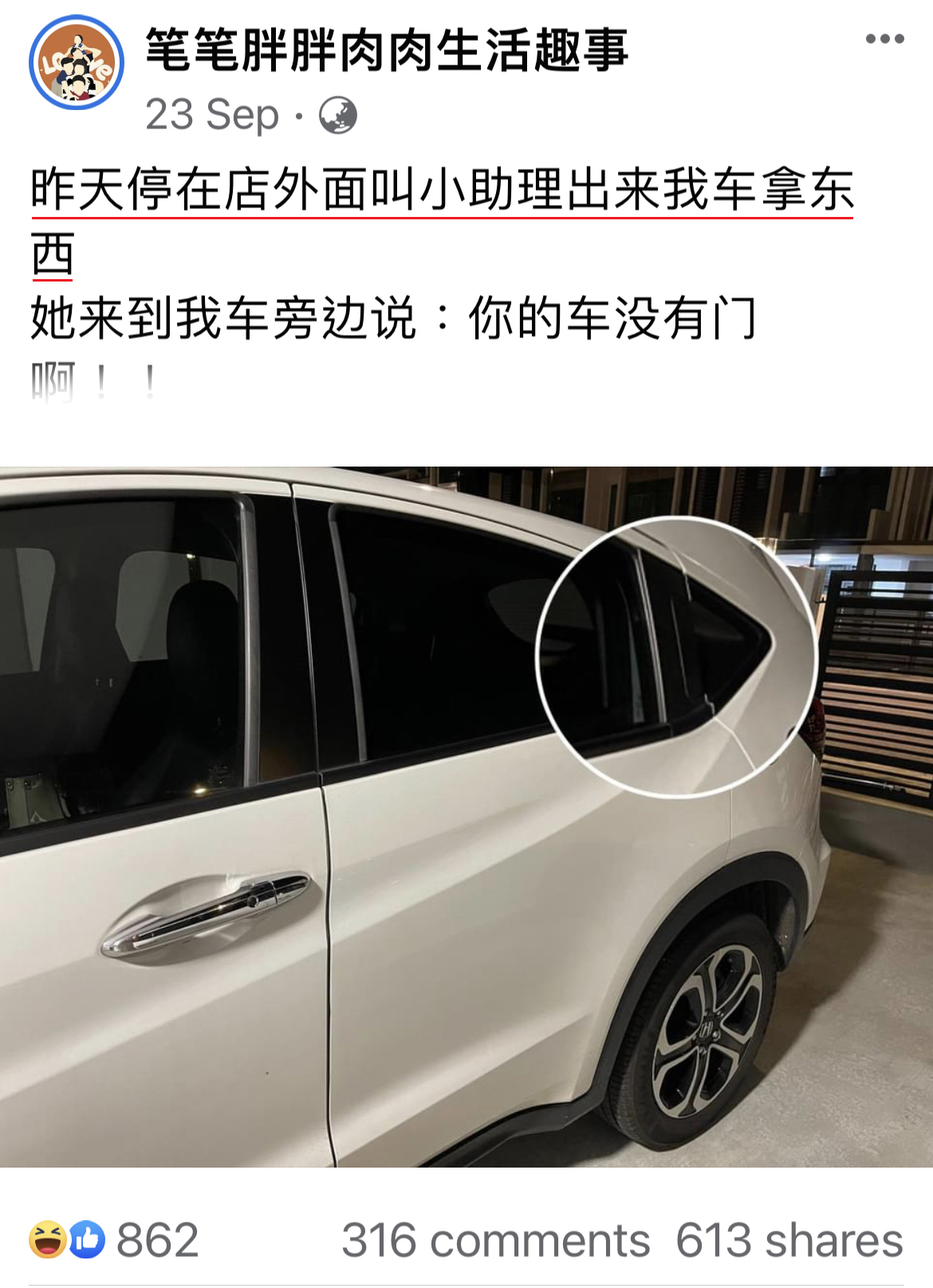 昨天停在店外面叫小助理出来我车拿东西,她来到我车旁边说:「你的车没有门啊!!」
