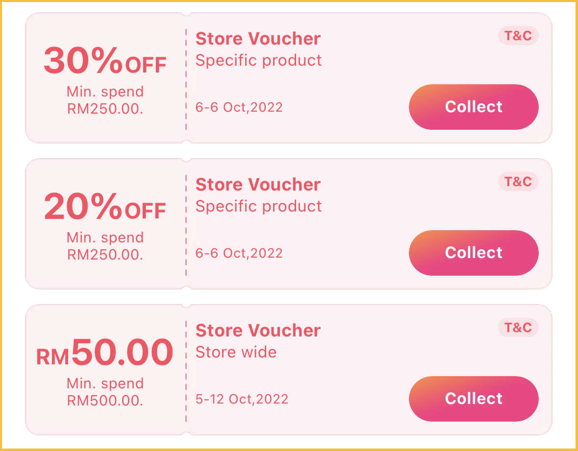 • 消费满RM500,折扣RM50