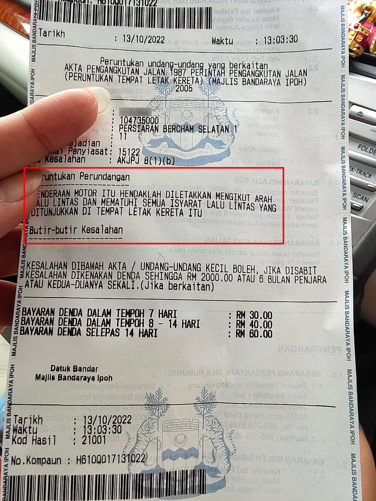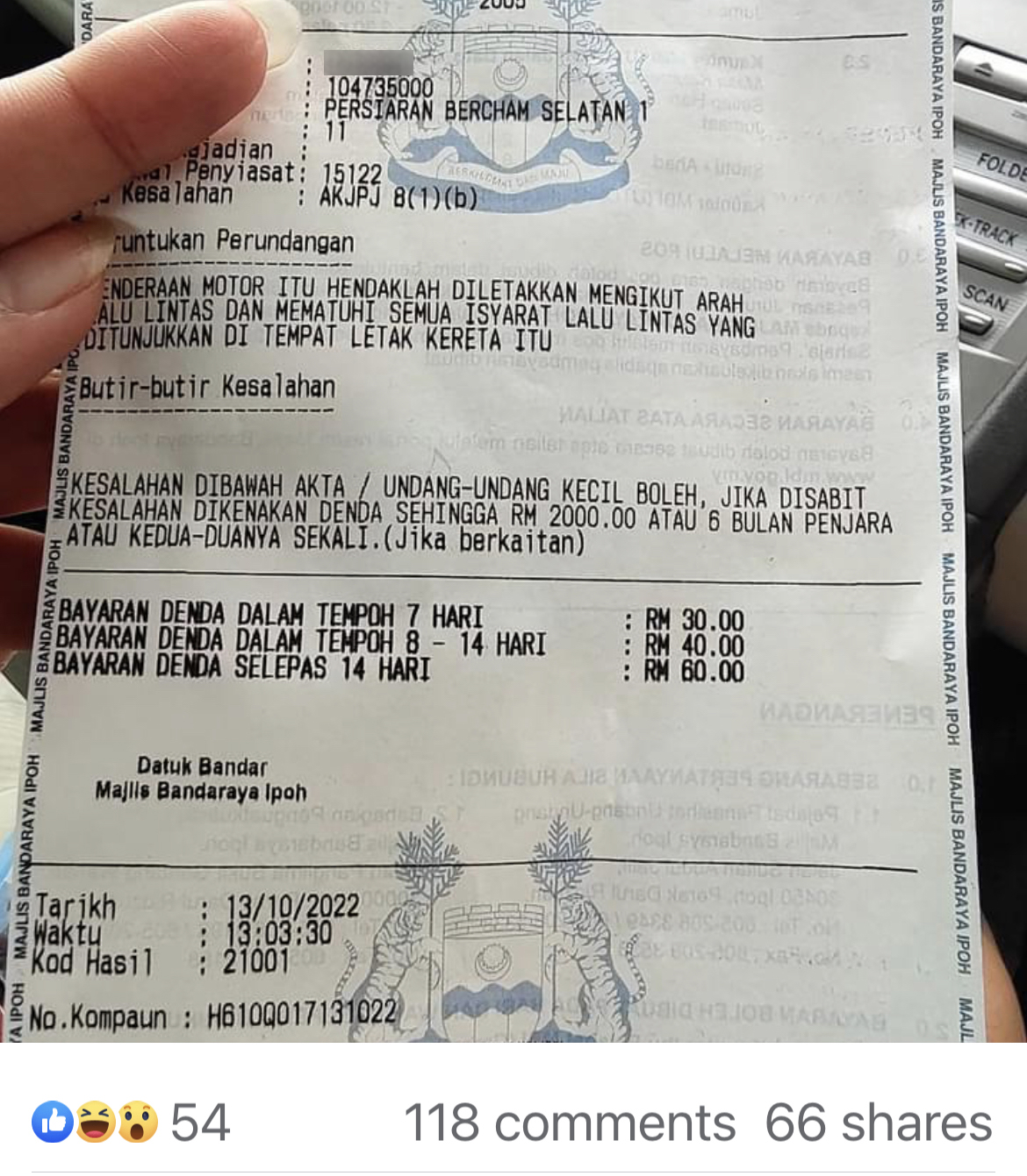 近日怡保一名网友在脸书发文,接获一张交警开的罚单,原来酱紫停车是salah的!评论区惊呼:今天才知道有这么一条 Undang,学会了!