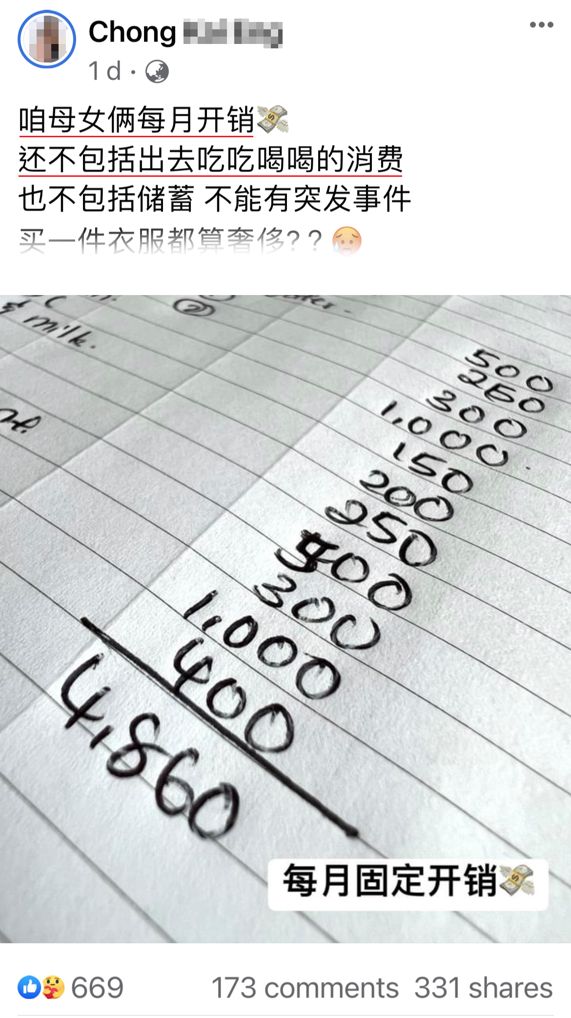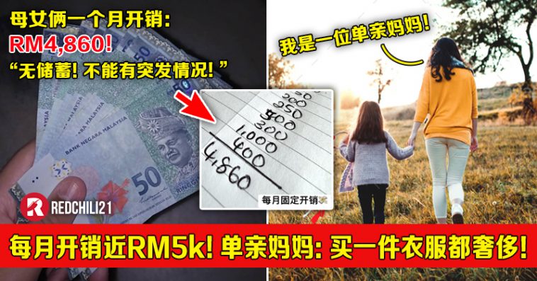 大马一位单亲妈咪近日在脸书感慨发文,省吃俭用、不包括储蓄,算一算两母女的一个月总开销就已经将近RM5,000,连买件衣服都觉得奢侈….