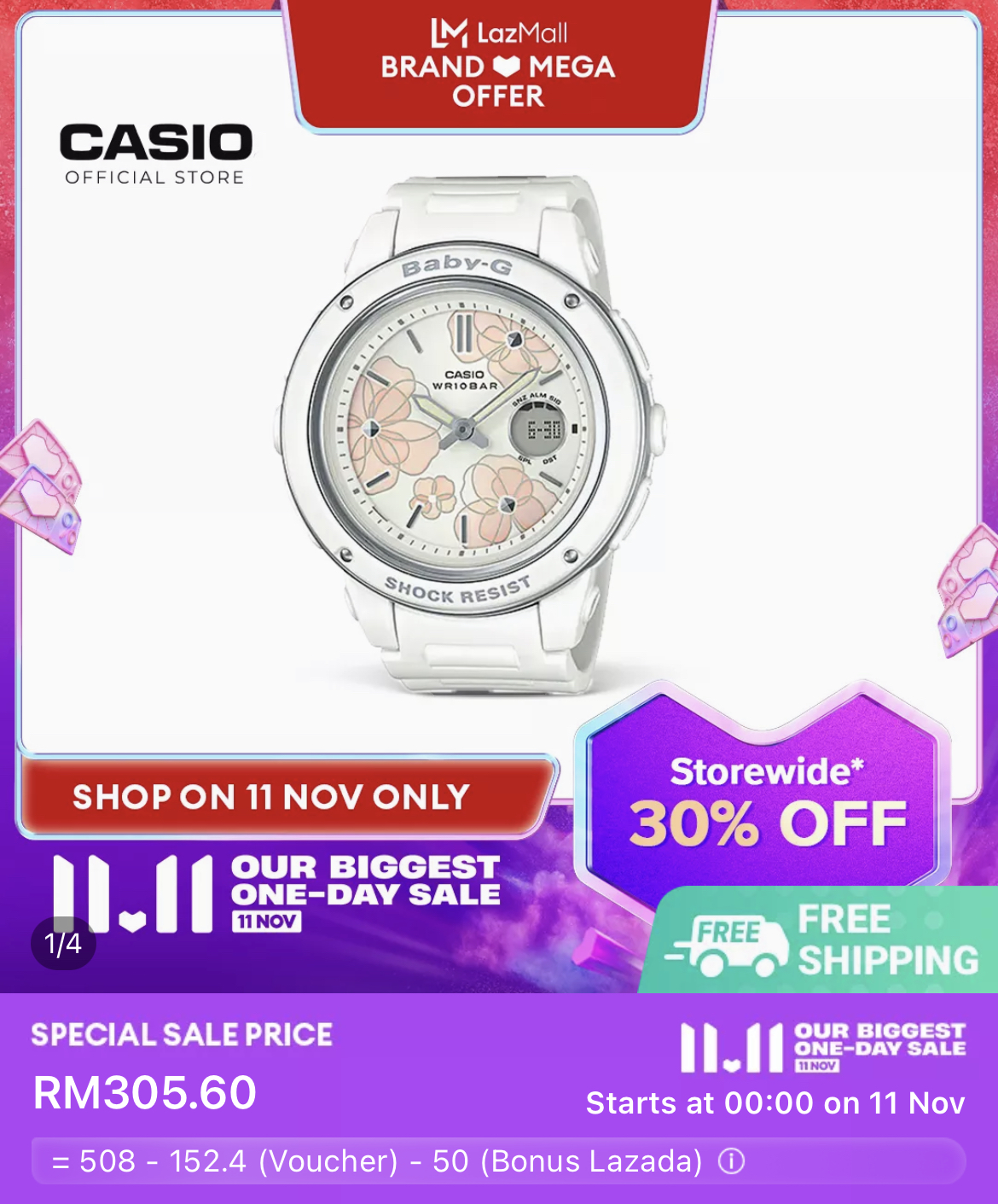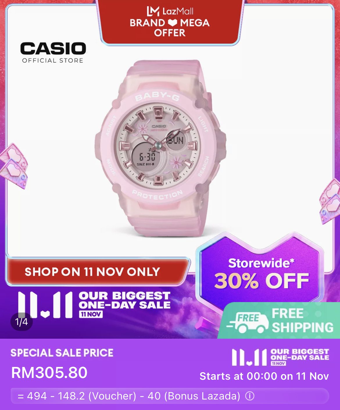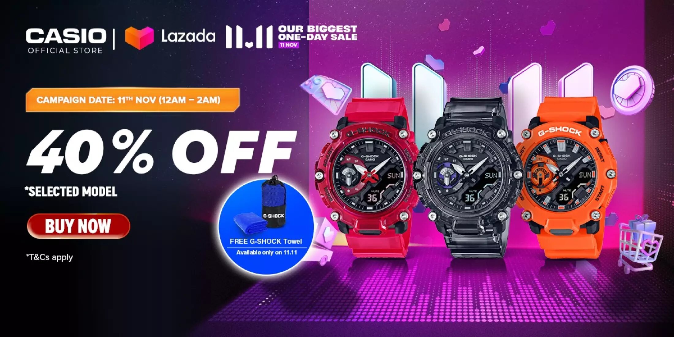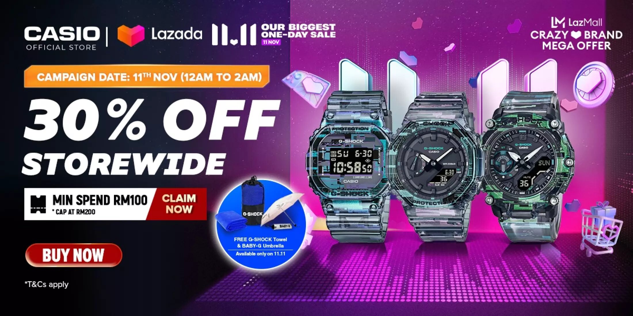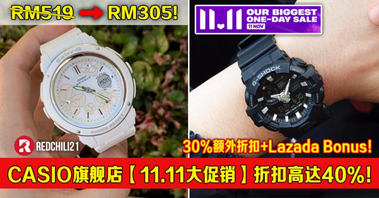 即将到来的11.11促销日,CASIO x Lazada 旗舰店全场折扣30%,指定款式高达40%,加上店铺送出的优惠券及 Lazada Bonus,扣完还能再扣!