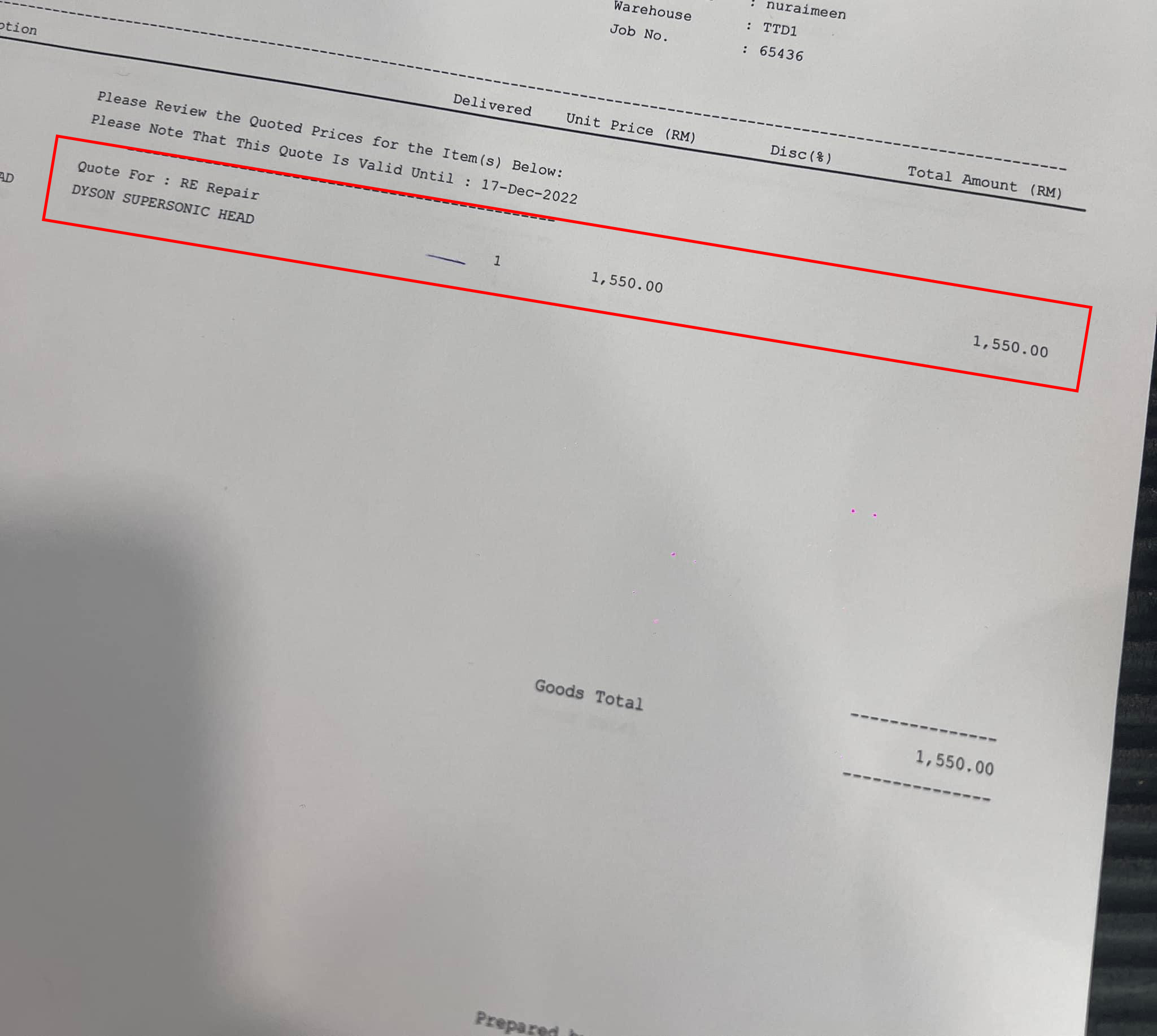 ▼ 这名来自吉隆坡的事主把故障的 Supersonic 吹风机带去 Dyson 服务中心咨询维修, 结果账单出来,“吹风机的风头” 维修费用是RM1,550!