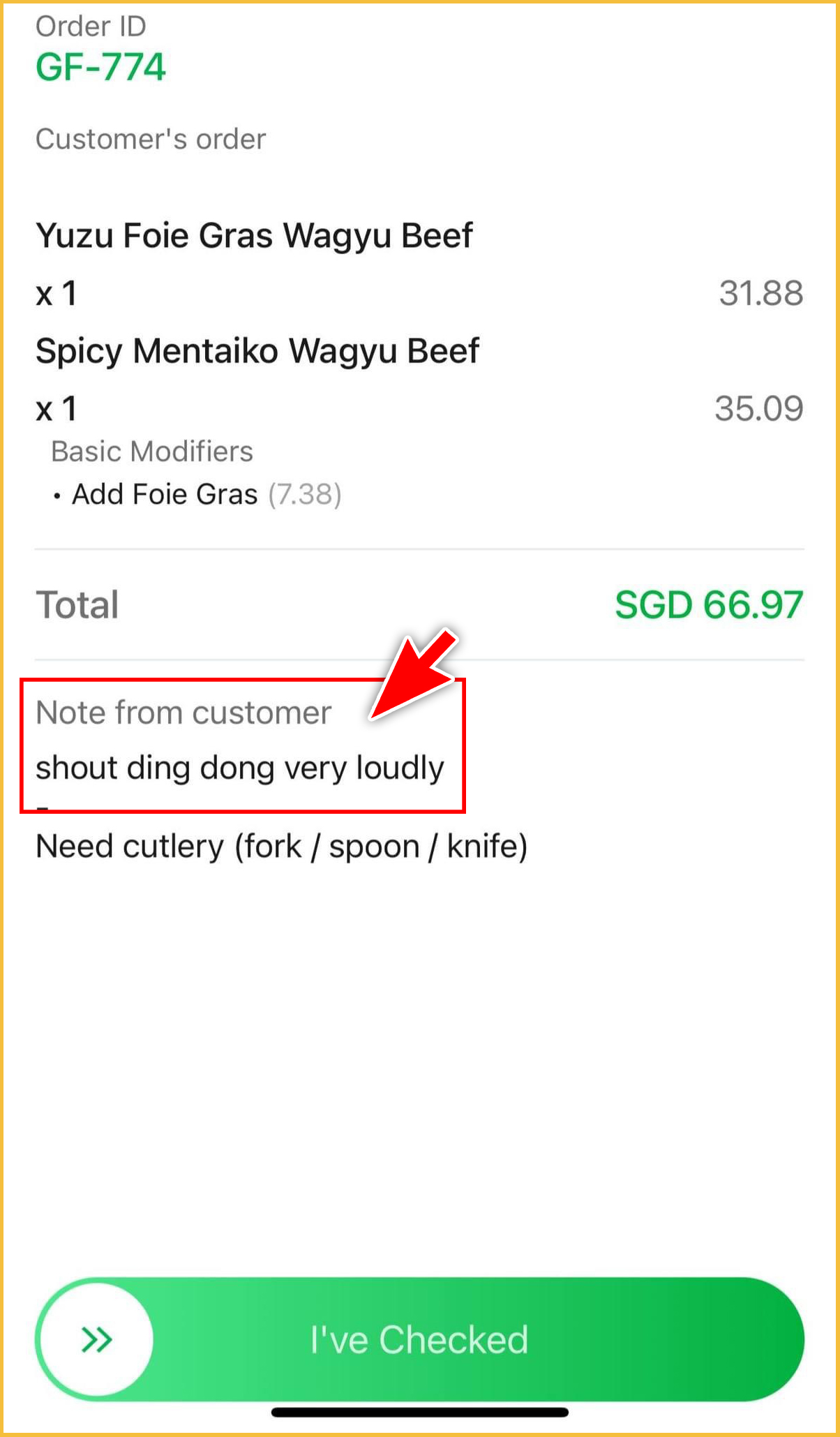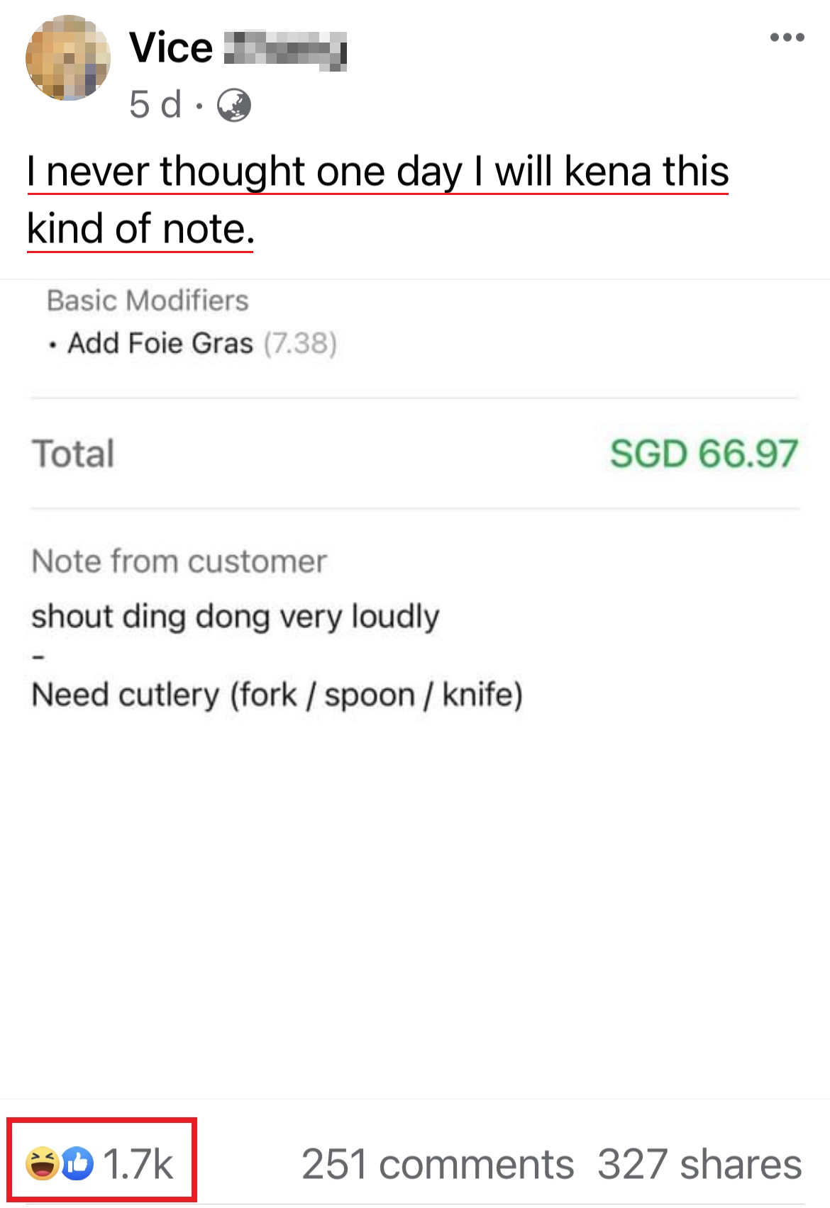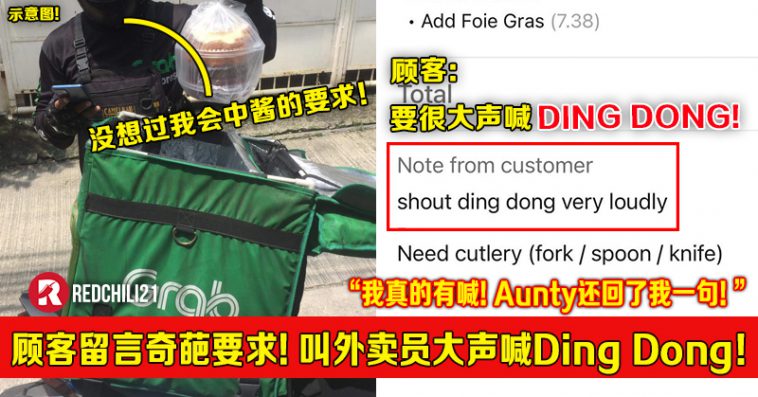 根据外卖员晒出的接单截图,该名顾客当天通过 Grabfood 平台点了2份牛排共66.97新币(约 RM220),下方留言除了“需要餐具” 还有另一条奇葩要求:「到了以后要非常大声地喊“Ding Dong”。」