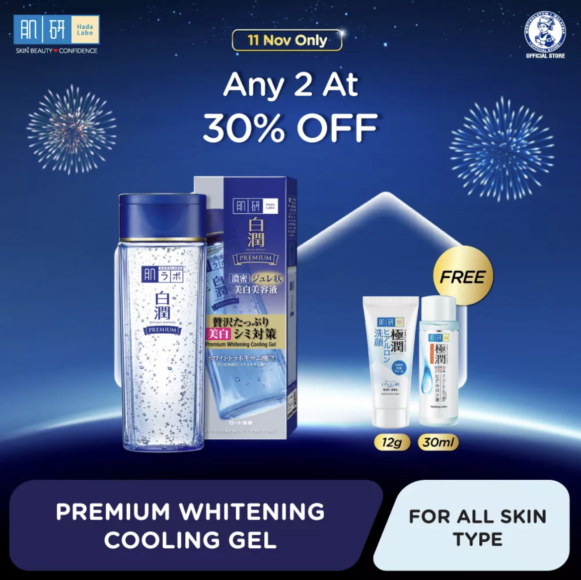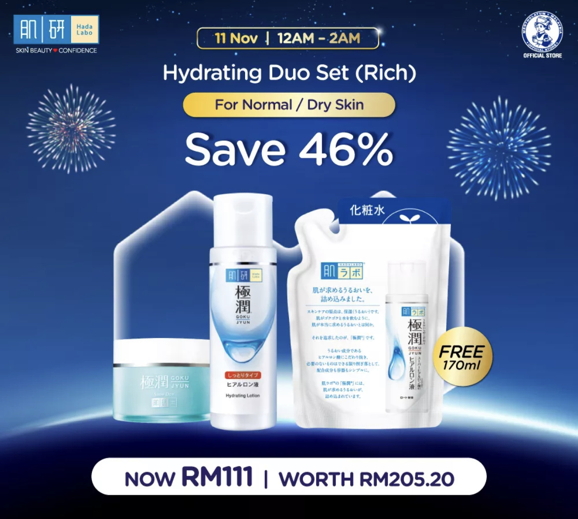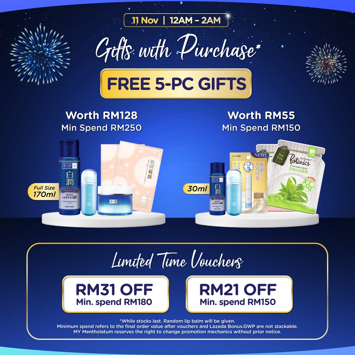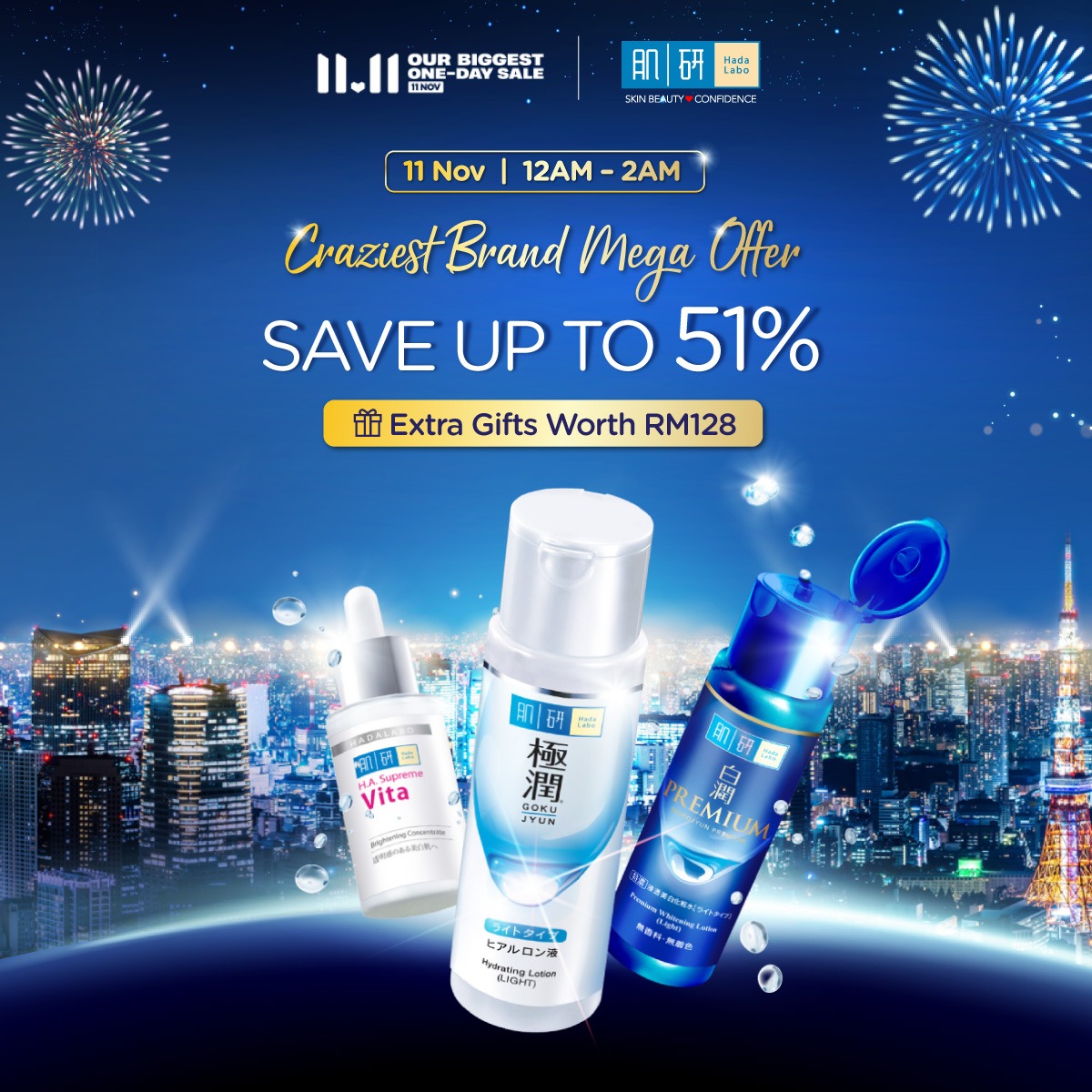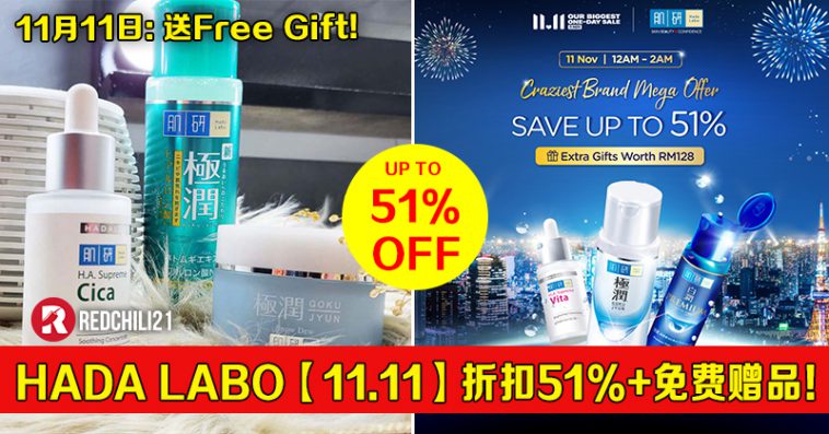 11月11日当天,Hada Labo 多款护肤品除了折扣高达51%,还送出价值高达RM128的赠品!有买就有送,买越多折扣越多!