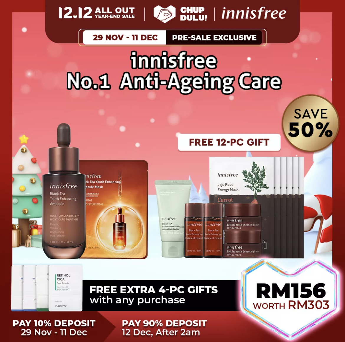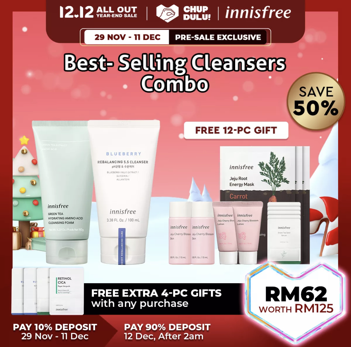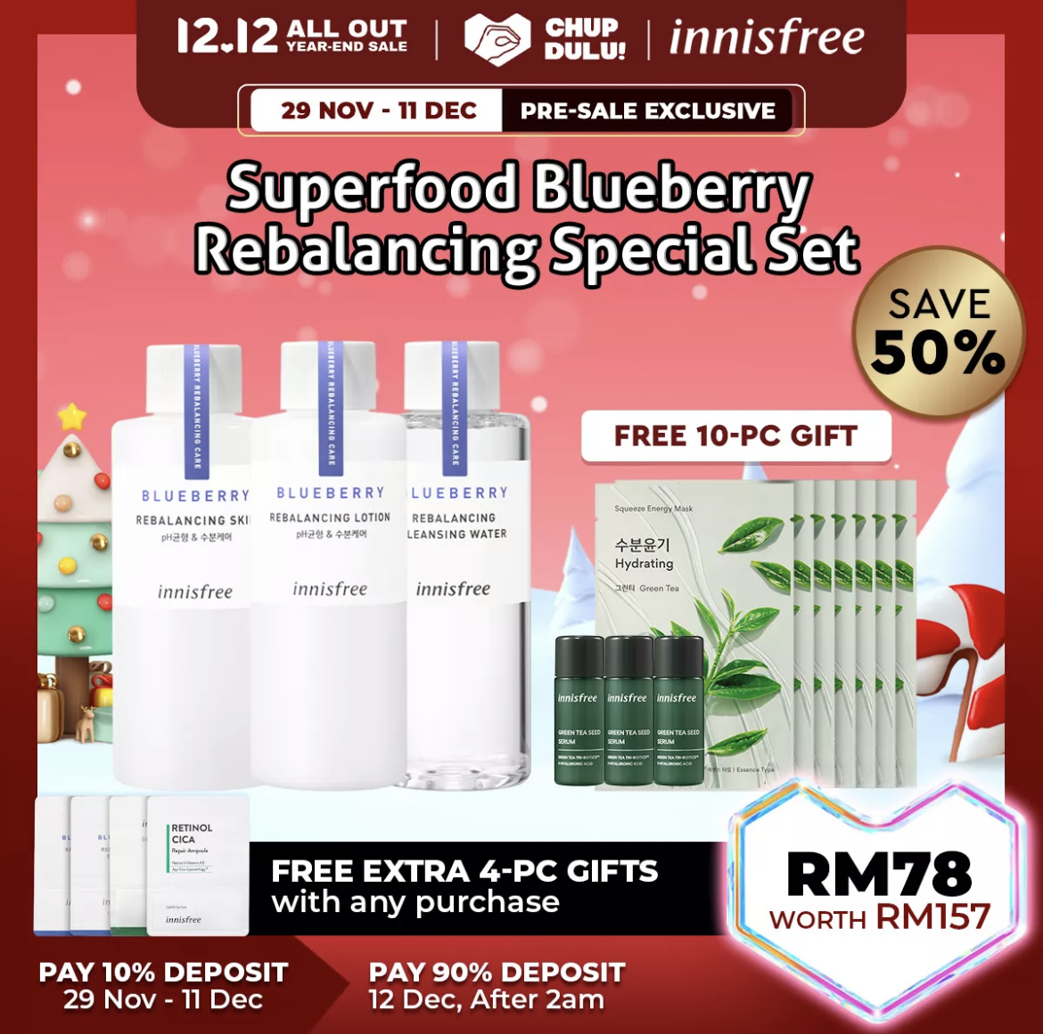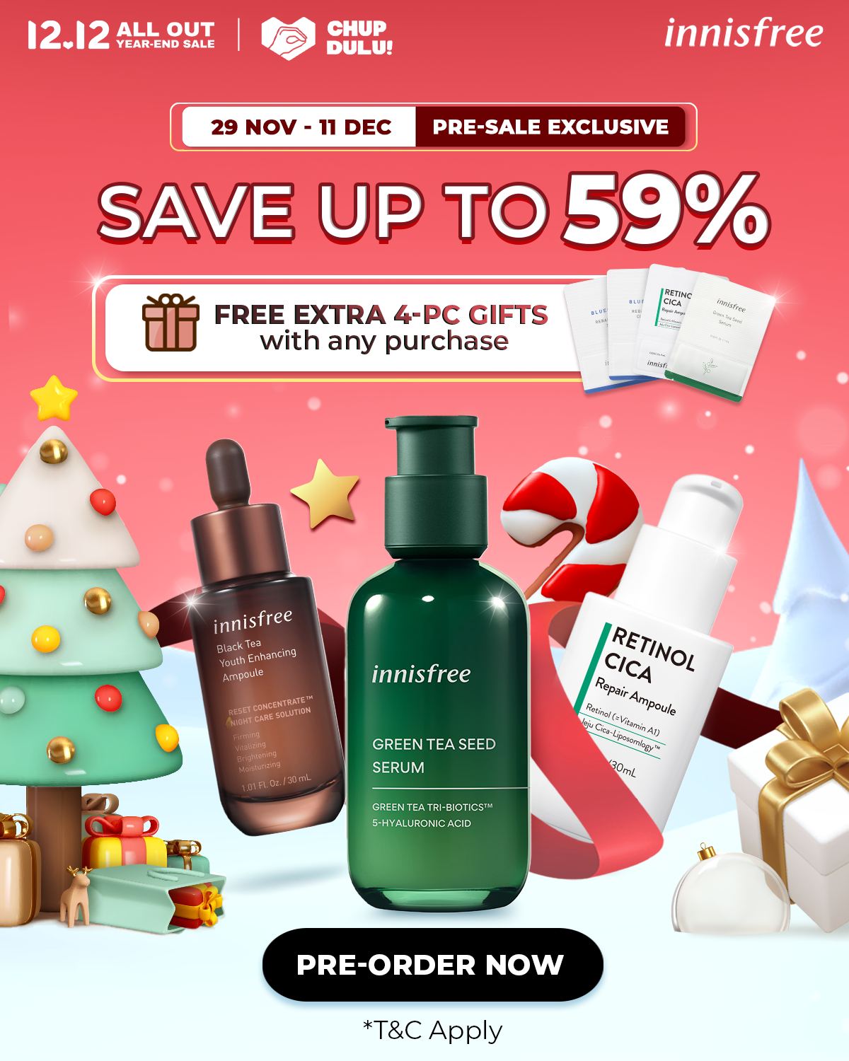 Innisfree 的粉丝们,看过来咯~配合即将到来的12.12购物节,Innisfree x LazMall 官方网店即日起举办预购优惠(Pre-sale),多款护肤品套装节省高达59%!