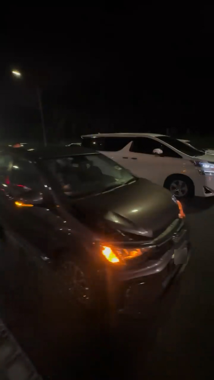▼ 该名苹果用户遇到小型交通事故,视频中可看到车头被撞凹,打着双向灯停靠在路上。