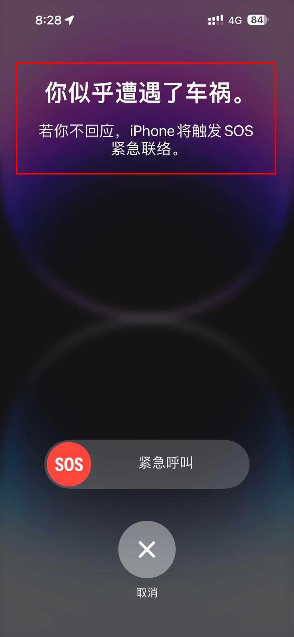 ▼ 与此同时,事主的 iPhone 14 手机自动启用“车祸侦测功能”,跳出提醒通知以及“SOS紧急呼叫”的滑块,让用户选择拨打紧急热线或点击“取消”关闭提醒。
