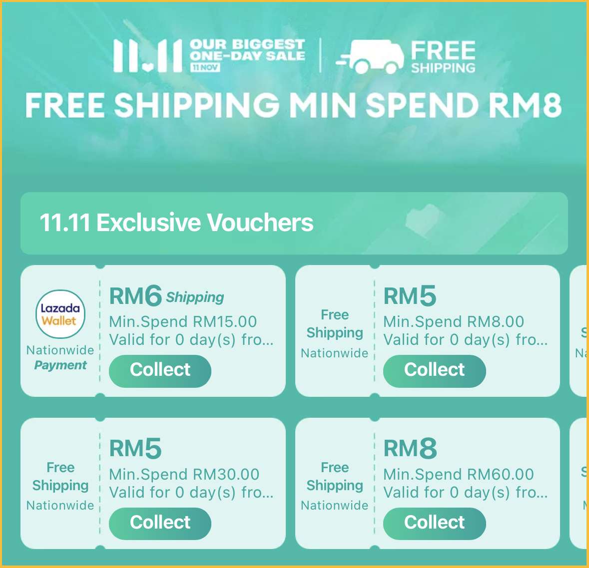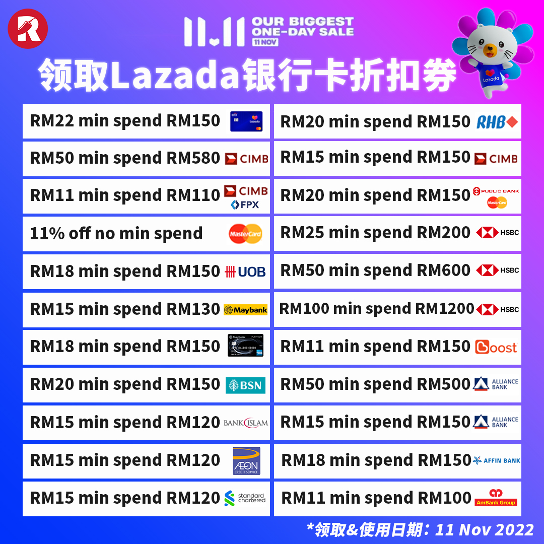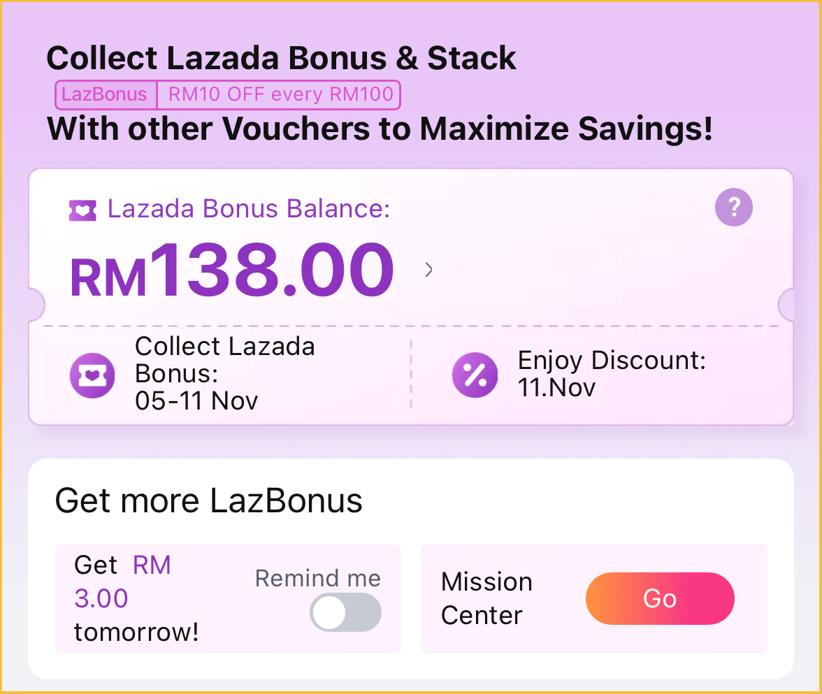 即日起至11月11日,领取 Lazada Bonus 并在11月11日当天使用,消费满RM100折扣RM10!