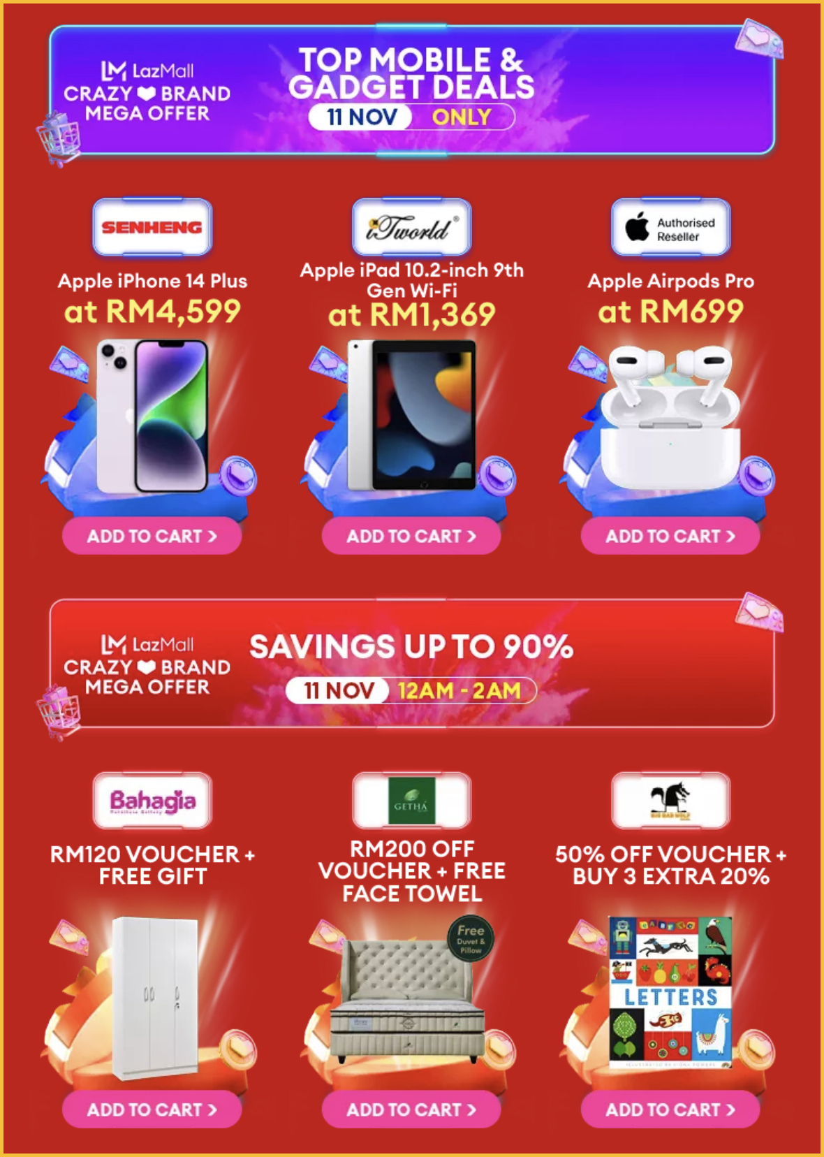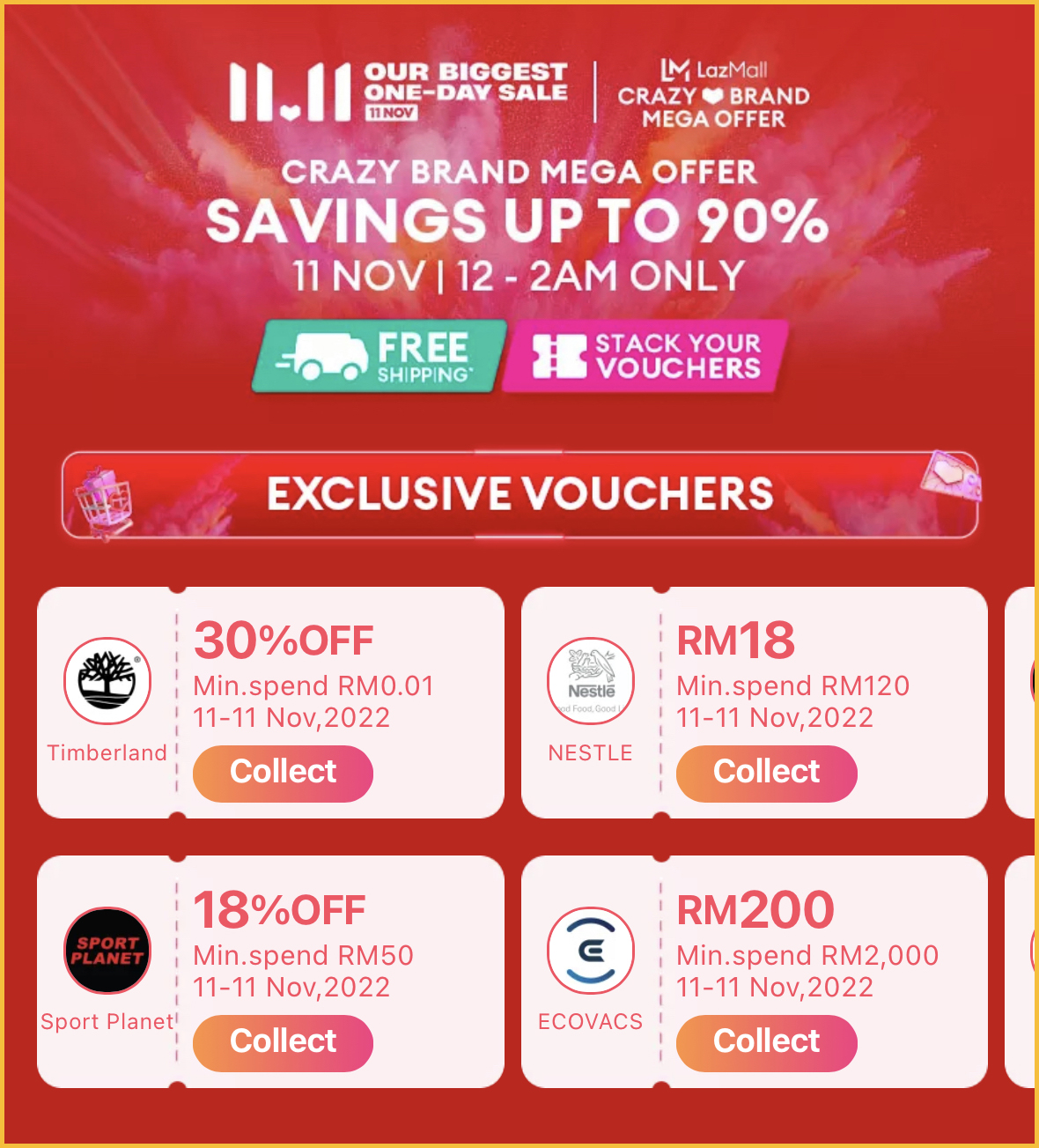 11月11日凌晨12点至2点还会有很多惊喜!许多商家将推出特别优惠,敬请留意 Brand Mega Offer 页面。