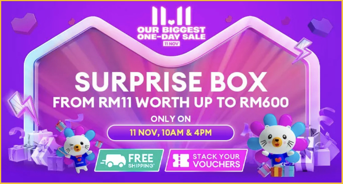Lazada 惊喜礼盒最低只需RM11,价值高达RM600!11月11日当天分为2个时段(10am及4pm)推出该优惠活动,记得抢购咯~