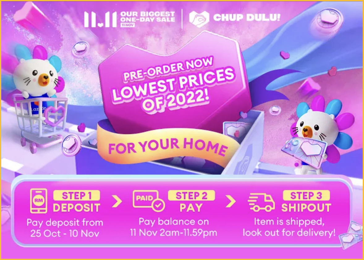 即日起至11月10日,只要在有举办的 Chup Dulu 优惠的店铺选购指定商品并预付10%订金,11月11日当天再付剩下的金额。比平时原价便宜很多哦!