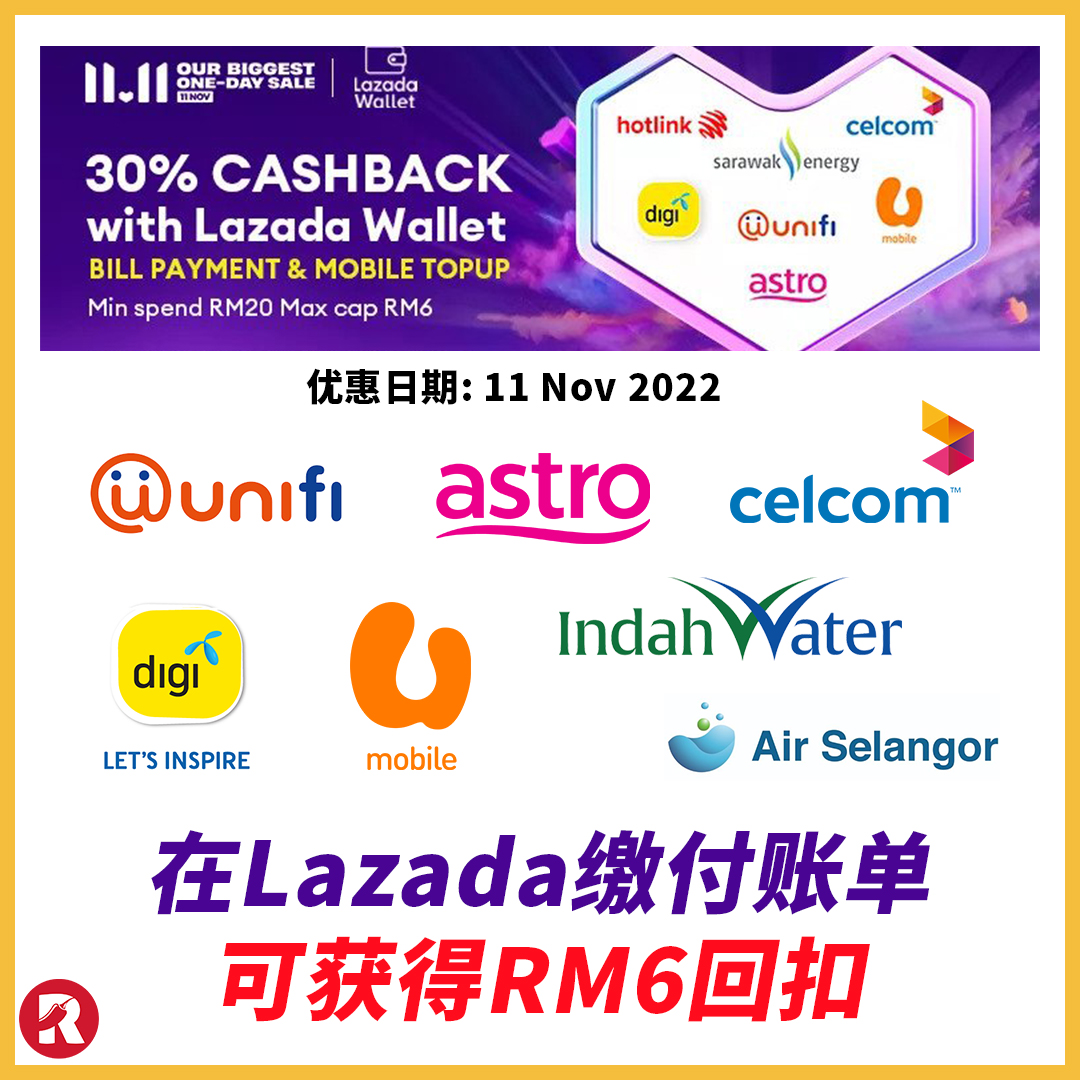 11月11日当天在 Lazada 缴付账单,可获得RM6回扣!
