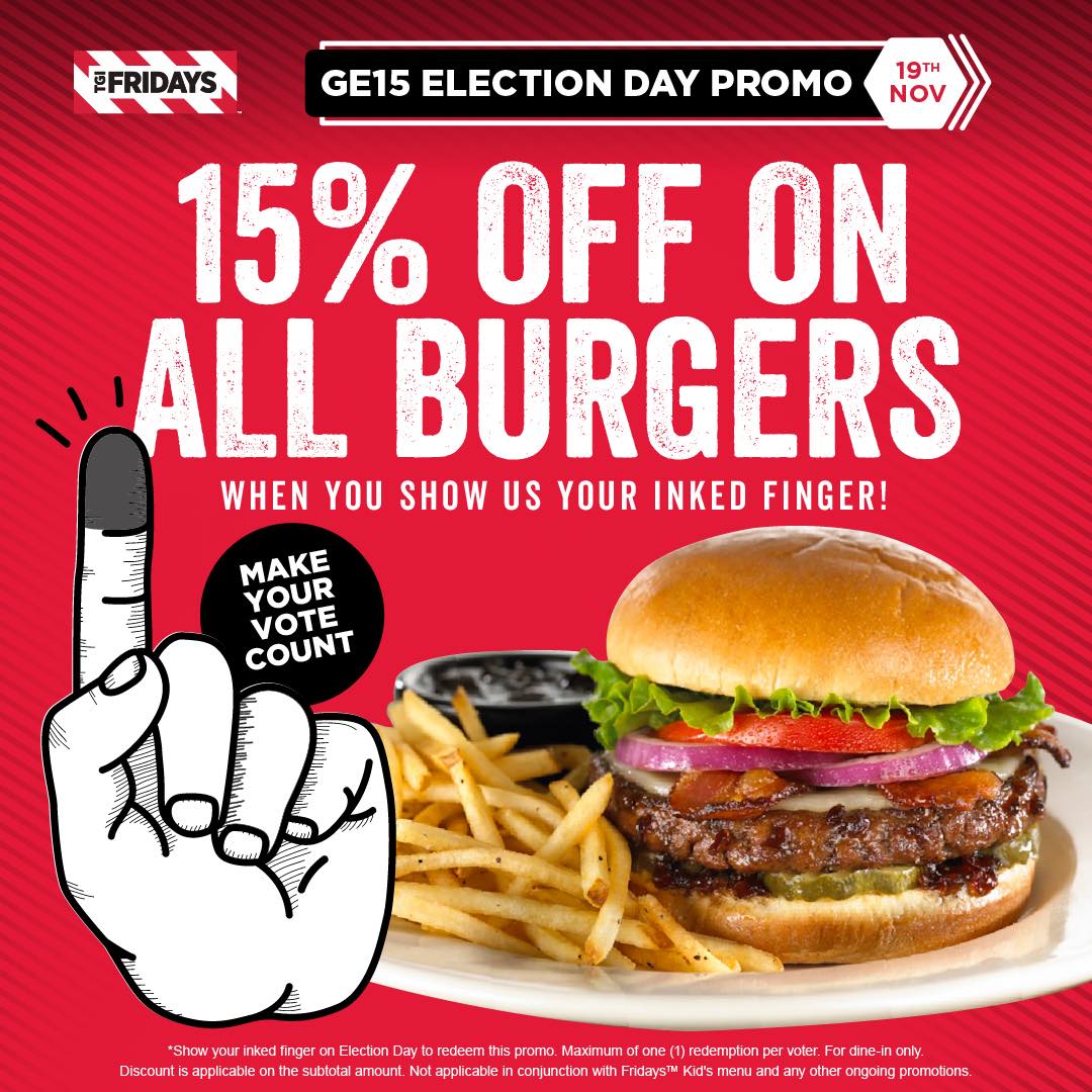 促销活动:TGI Fridays 投票日优惠 – 汉堡折扣15%