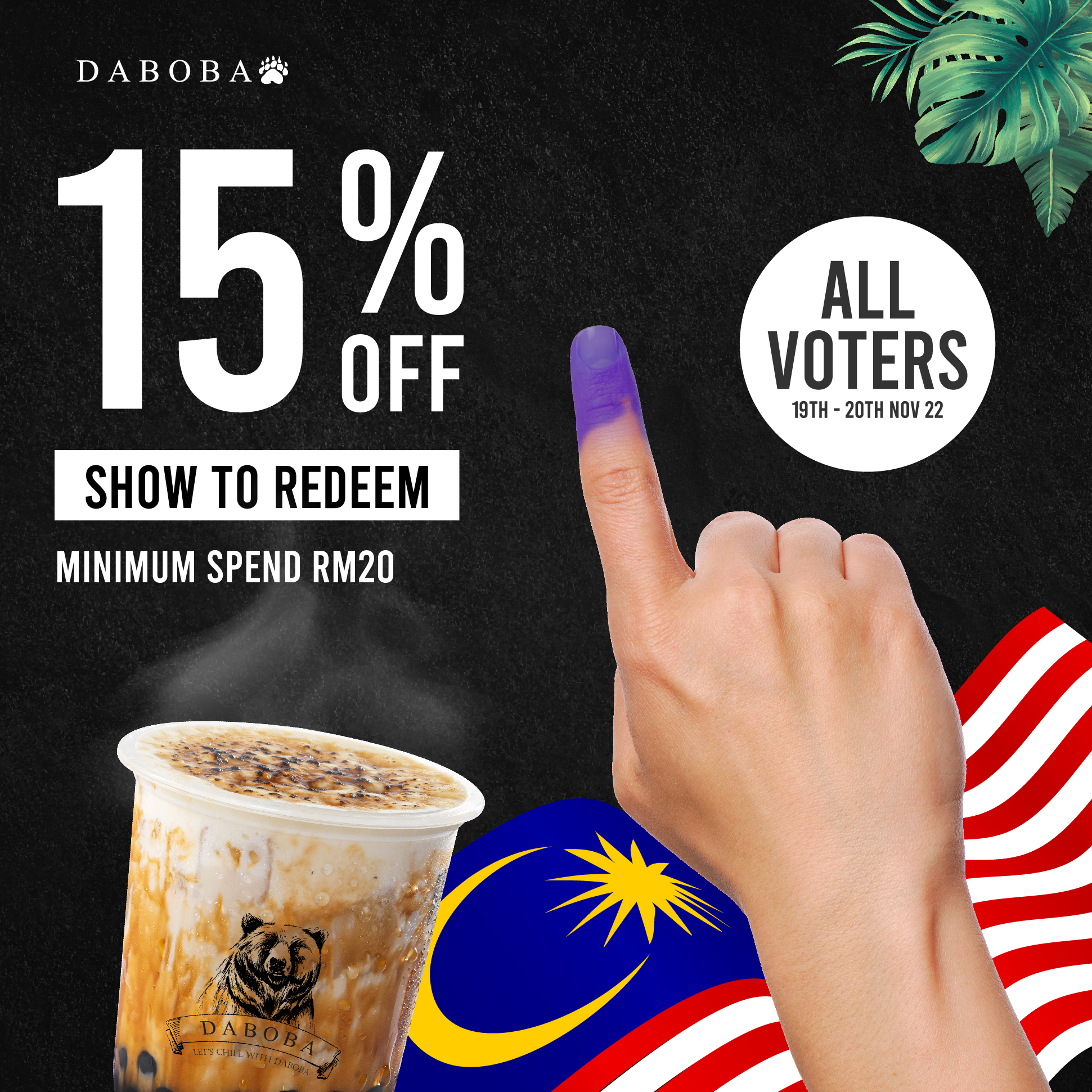 促销活动:Daboba 投票日优惠 – 消费满RM20获15%折扣