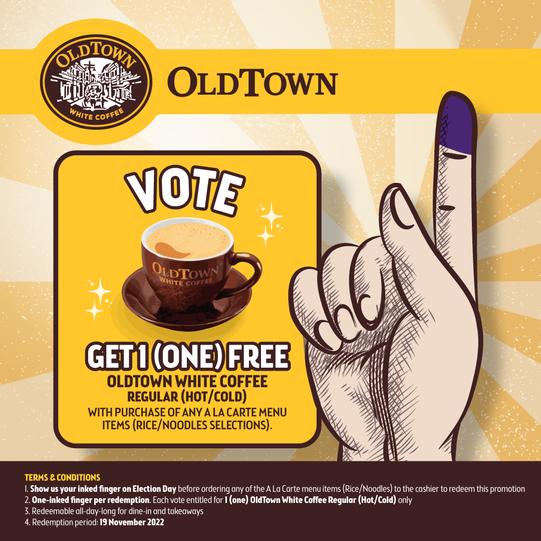 促销活动:OLDTOWN 投票日优惠 – 单点一份饭/面食,免费获取一杯白咖啡