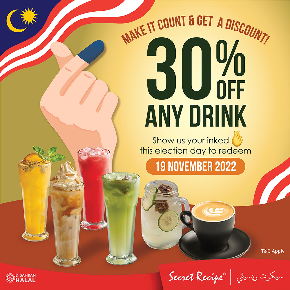 促销活动:Secret Recipe 投票日优惠 – 饮料折扣30%