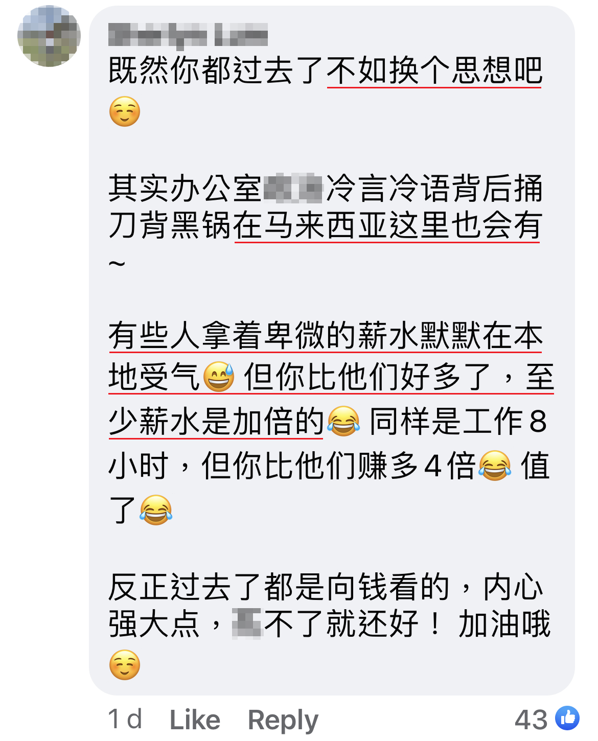 我向来自认是很难吃苦的人、不怕工作辛苦,但是工作环境的人却对我影响很大。来到这里之后,就开始想念马来西亚人,毕竟自己国家的人还是比较友善和有耐心的。