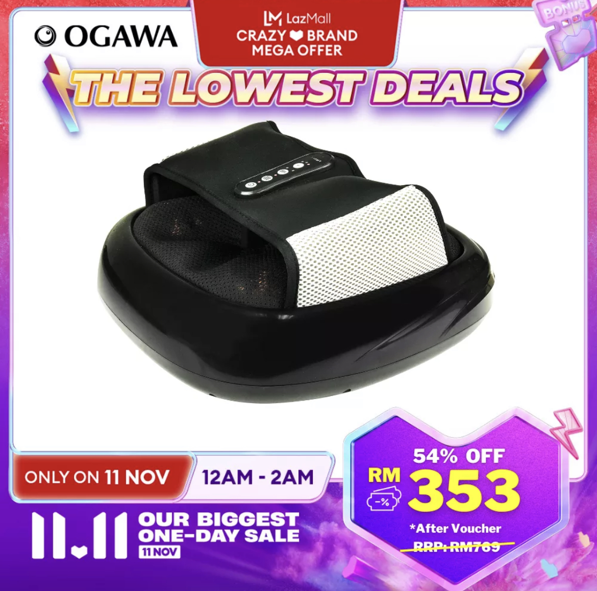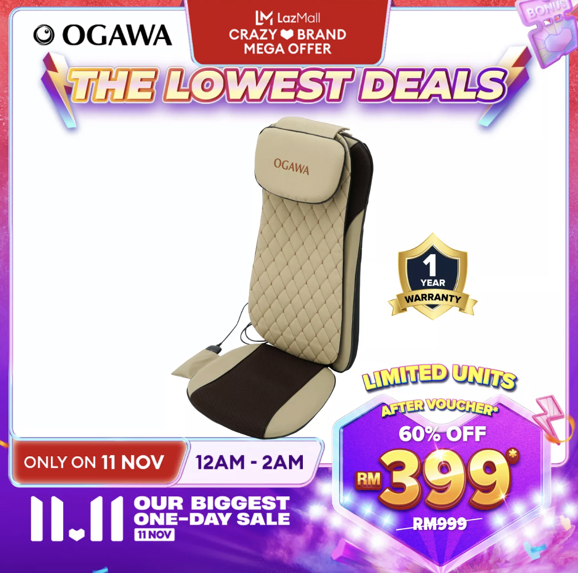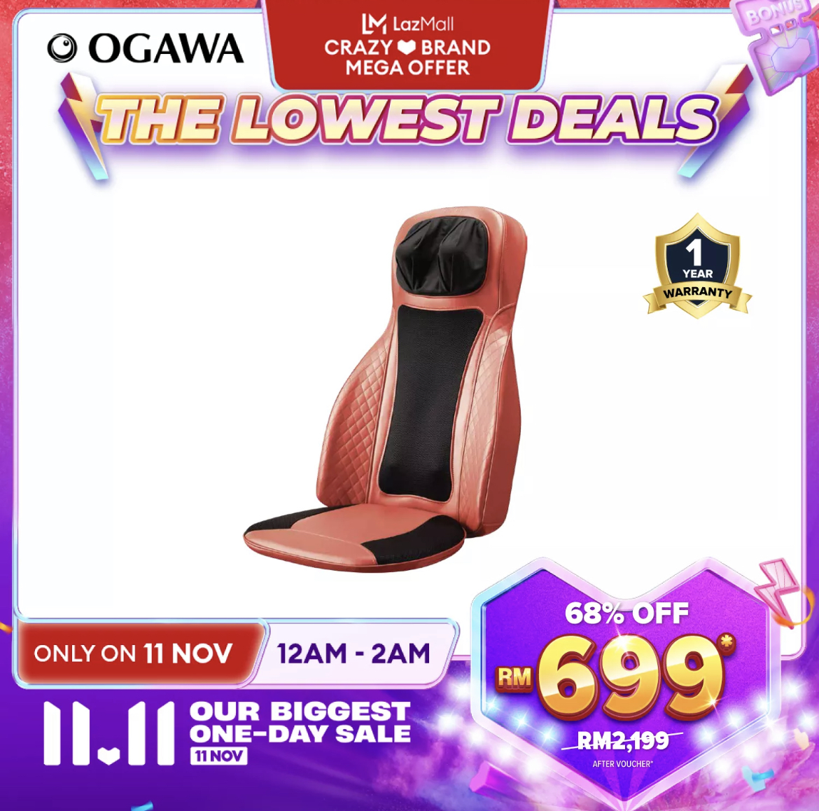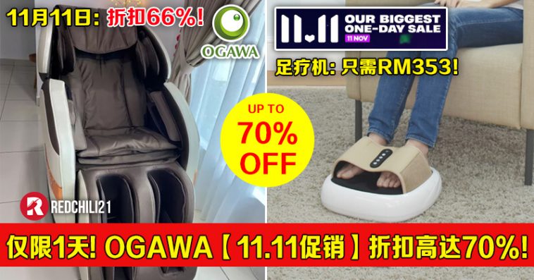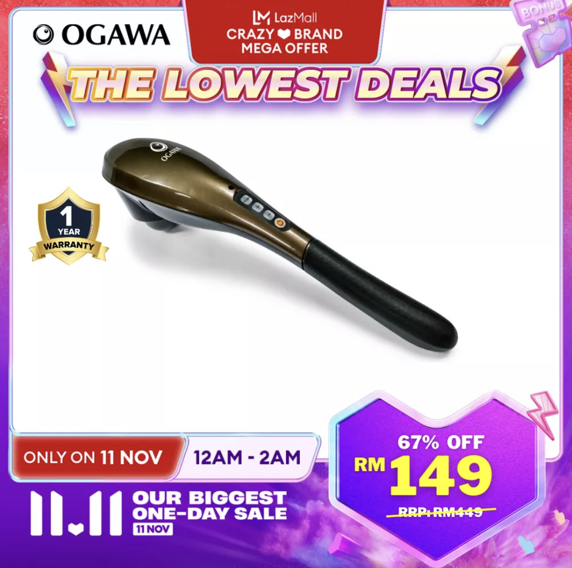 OGAWA x Lazada 官方网店举办今年内最大的促销活动,从小型按摩器到居家按摩椅,通通折扣高达70%!此外除了多达RM200额外折扣券,还可以再扣 Lazada Bonus 哦!