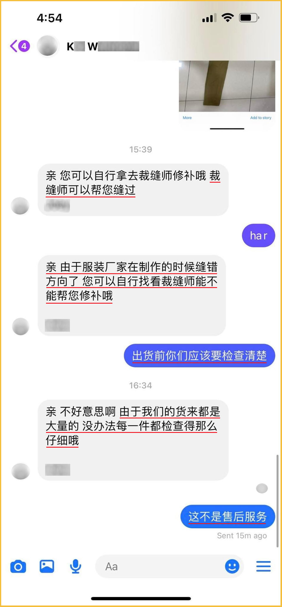 ▼ 将问题反馈给卖家希望能提供售后服务,却没想到客服的回复是:「亲,您可以自行拿去给裁缝师修补哦!」