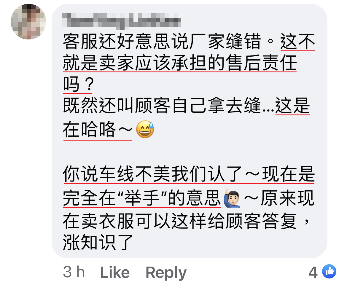 大马女子近日在脸书直播下单一件小外套,拿到货时袖子竟然是反的!重点是:客服人员不退款、不退货,叫顾客自己去找裁缝师花钱修改!