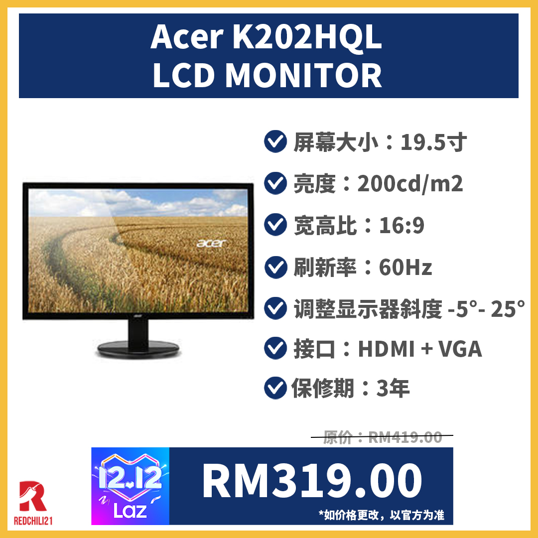 ▼ ACER 19.5” LCD MONITOR K202HQL ABIX 显示器